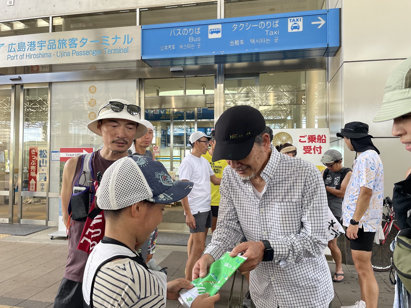 今回ゴールの宇品港に向けて宇品の海岸線を一緒に歩かせていただいているときに、前や後ろから人や自転車が近づいてくると「後ろから自転車来るよー」と声をかけてくれる仲間。自然に端に寄り道を開けます。