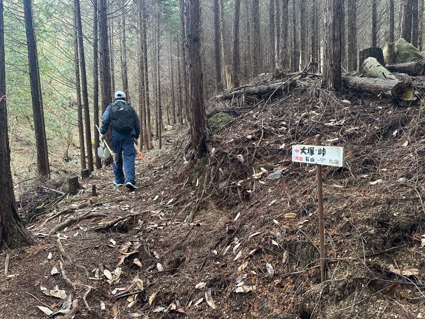 ここで2チームに分かれます。本線へのアクセスルート「イチダイトレイルの下りにロープを設置するチーム」はT会長とHさんの2人ペア、残る11人が整備の手つかずの「大塚峠登山口~大塚峠」区間の巡視整備を行うこととしました。