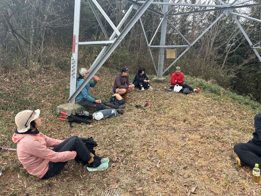 宗箇山分岐のすぐ先の鉄塔下のスペースで11人が合流。T会長チームは急斜面の安全確保にしっかりと時間をとって対応していることを確認、各々お昼休憩を取ることとしました。