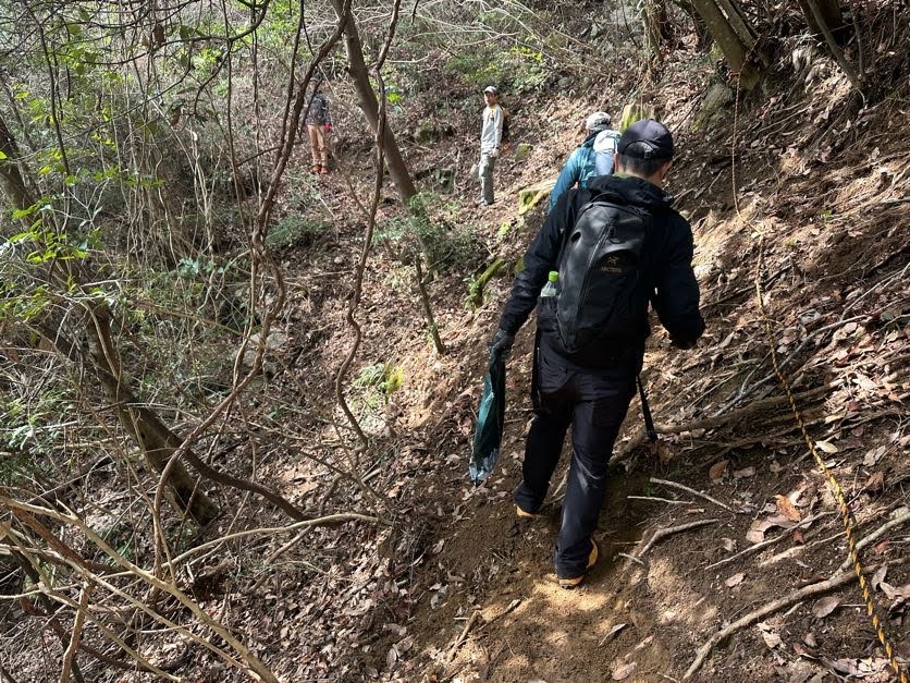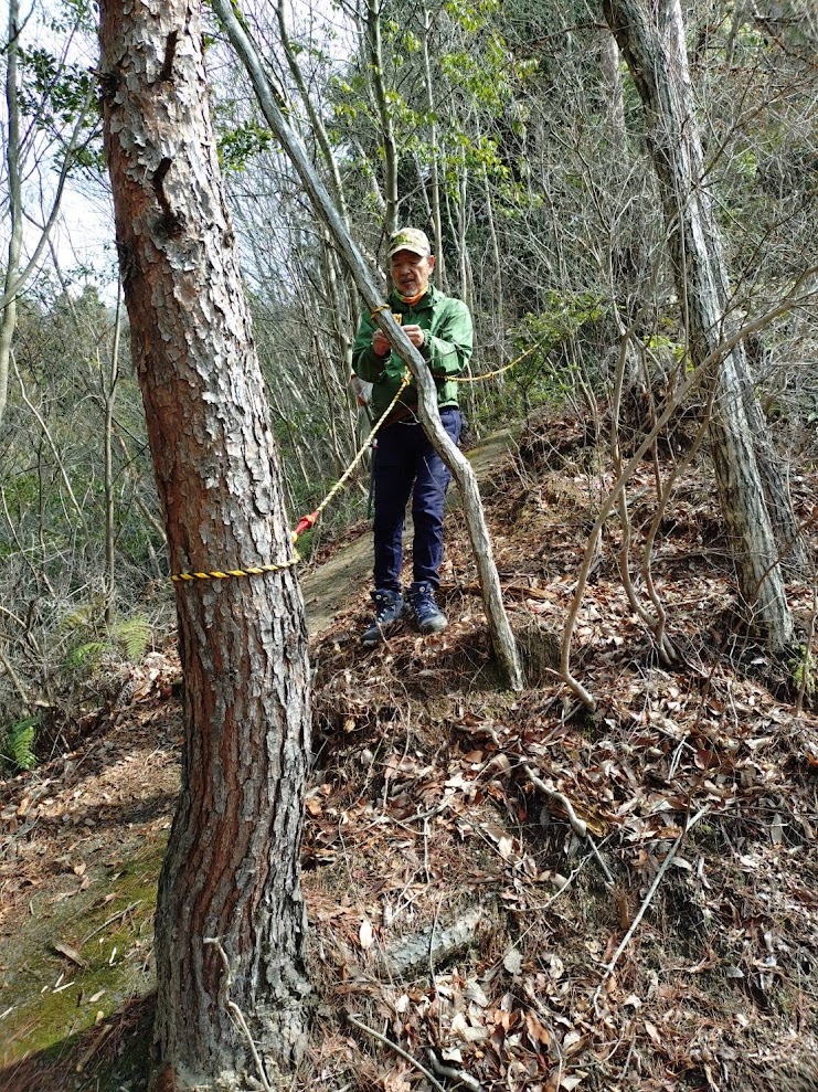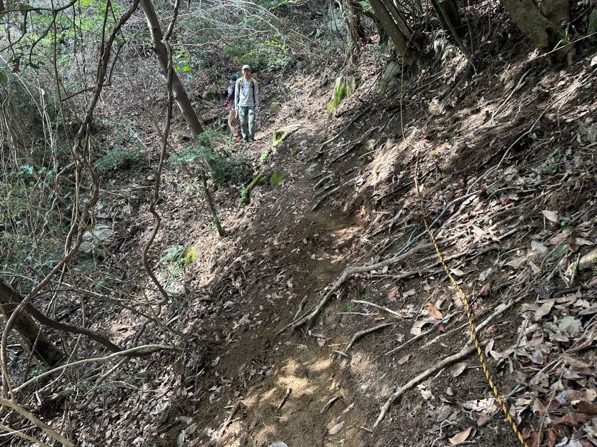 「どこまで荒れてどの程度整備に時間がかかるかわからない」こともあり、足早に進む先行チーム。途中2か所急勾配の箇所にロープを設置、甑岩にピストンするも、11時半頃には宗箇山への分岐地点に到着。