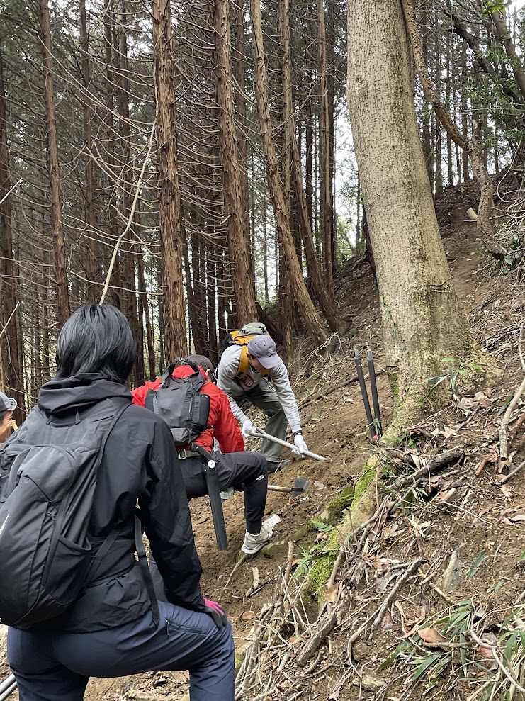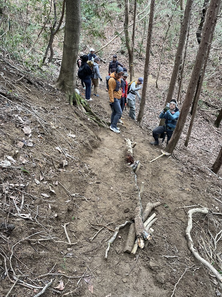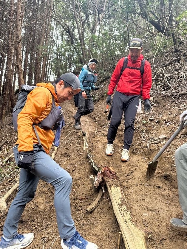 ②、③のいずれもが時間がかかると予想され、2チーム(ロープ設置は2人)に分かれての活動。本線上で合流の予定でしたが、ロープ設置は思いのほか時間がかかり、大塚峠登山口~大塚峠区間は、豪雨災害後道の荒廃が著しいと聞いていたものの、倒木が少なかったため思いのほかスムーズに進行。④の地点ではトレイルランナー目線とハイカー目線の違いなども共有しながら整備を行い、予定より早く無事すべてのミッションコンプリート!2チームそれぞれのゴールとなりました。