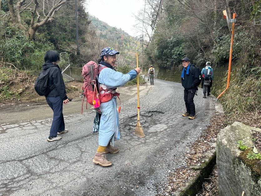 現場の先では、道に差し掛かる枝葉を除けたり、道を掃いたり掃いたあとの木の根っこをカットしたり、時間を無駄にせず整備に余念がない皆さまの姿が!