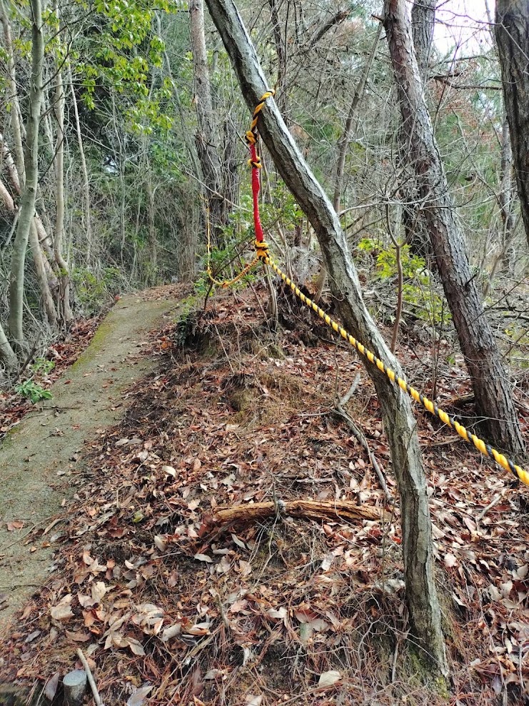 ②イチダイトレイル下山口近く、舗装された斜面の安全確保(ロープ設置)