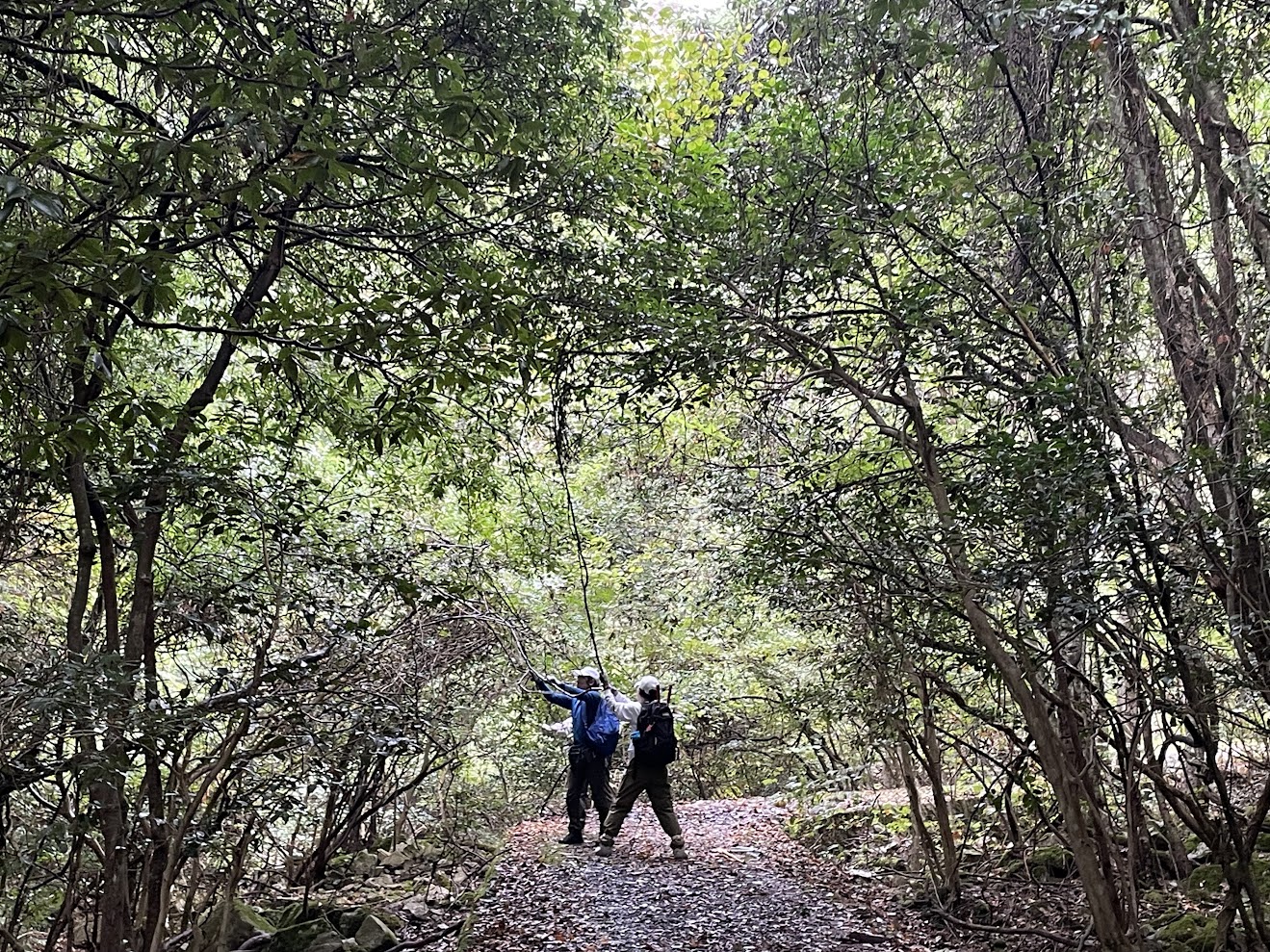 道は広くてしっかりしていても、枯れたツルなどが頭上から垂れ下がっているとなんだか薄気味悪い印象があります。手元の道具を使って届くものは下に引っ張り除けてスッキリ♪