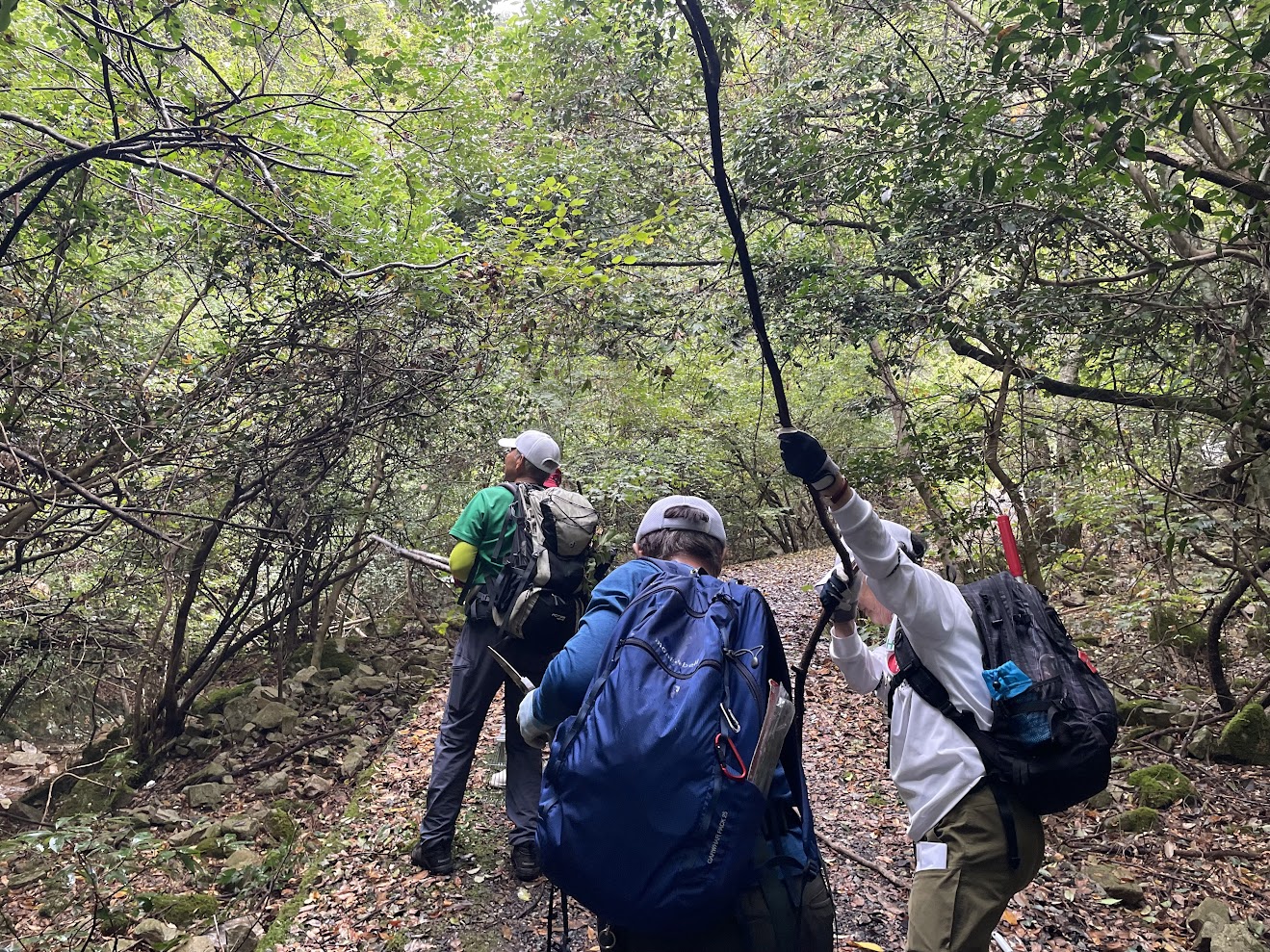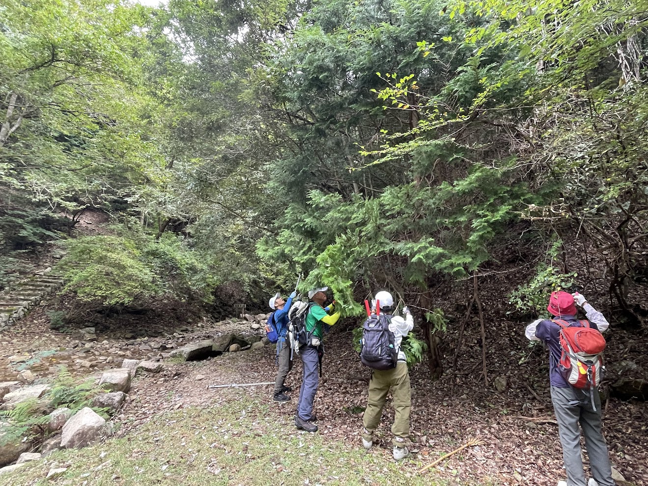 滝へのアプローチの見通しを良くし、下をくぐって走っても頭に当たらない高さまで全員が空を仰ぐようにして刈り込みます。