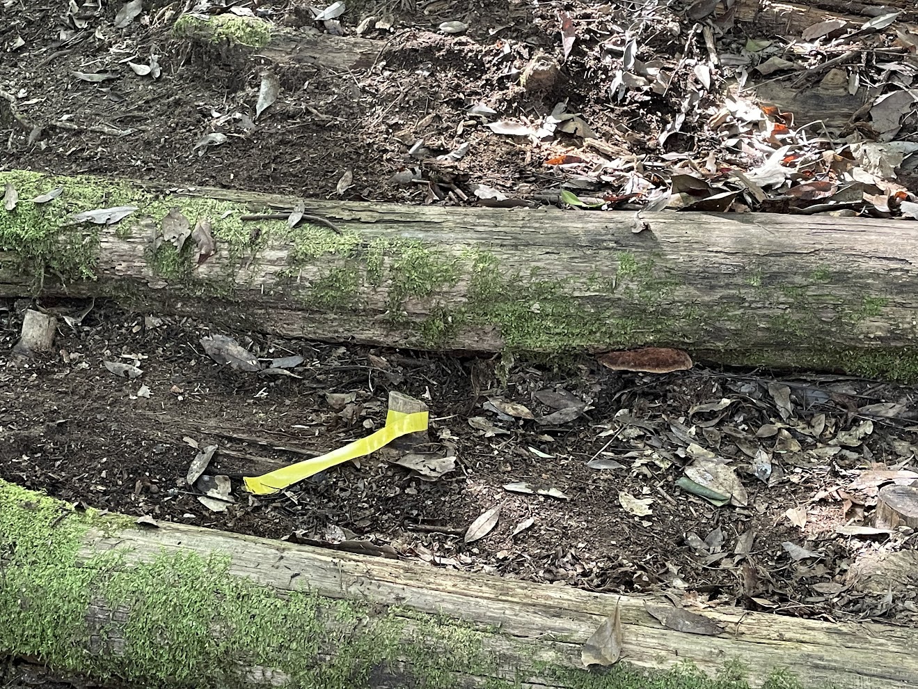 落葉に隠れていた突起物。掃いてむき出しにし、黄色テープで注意喚起します。