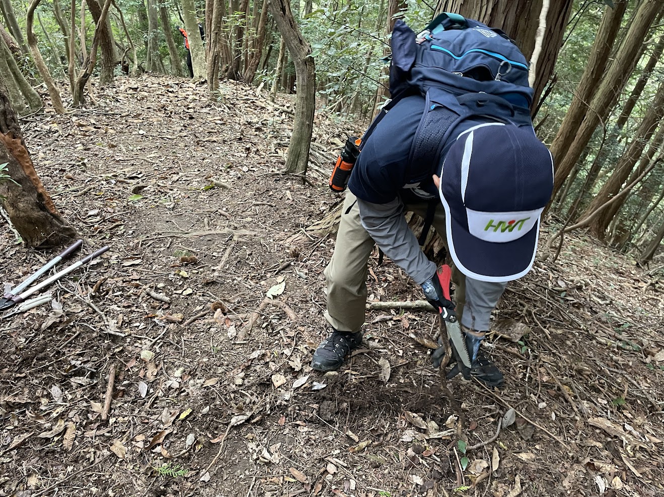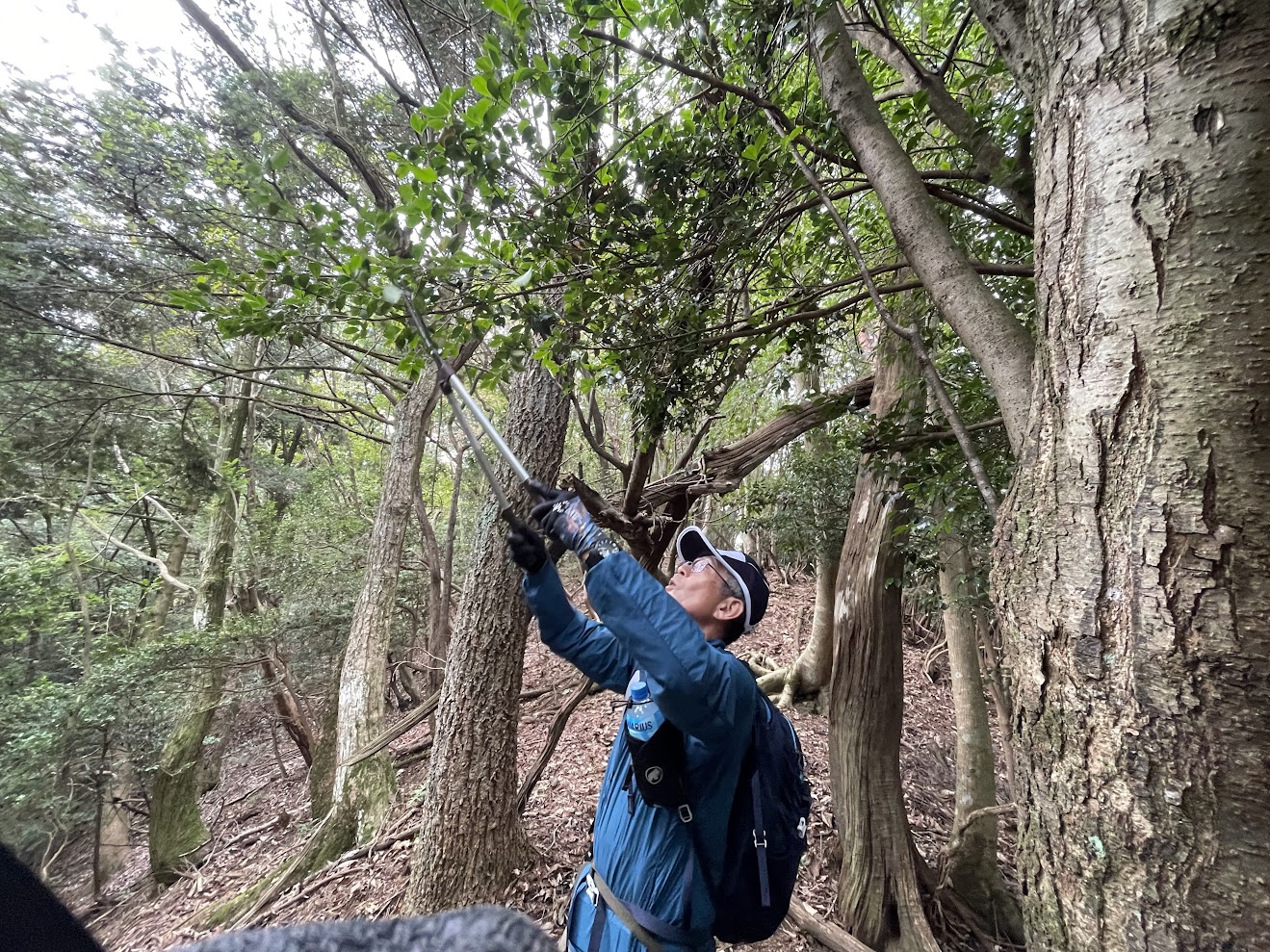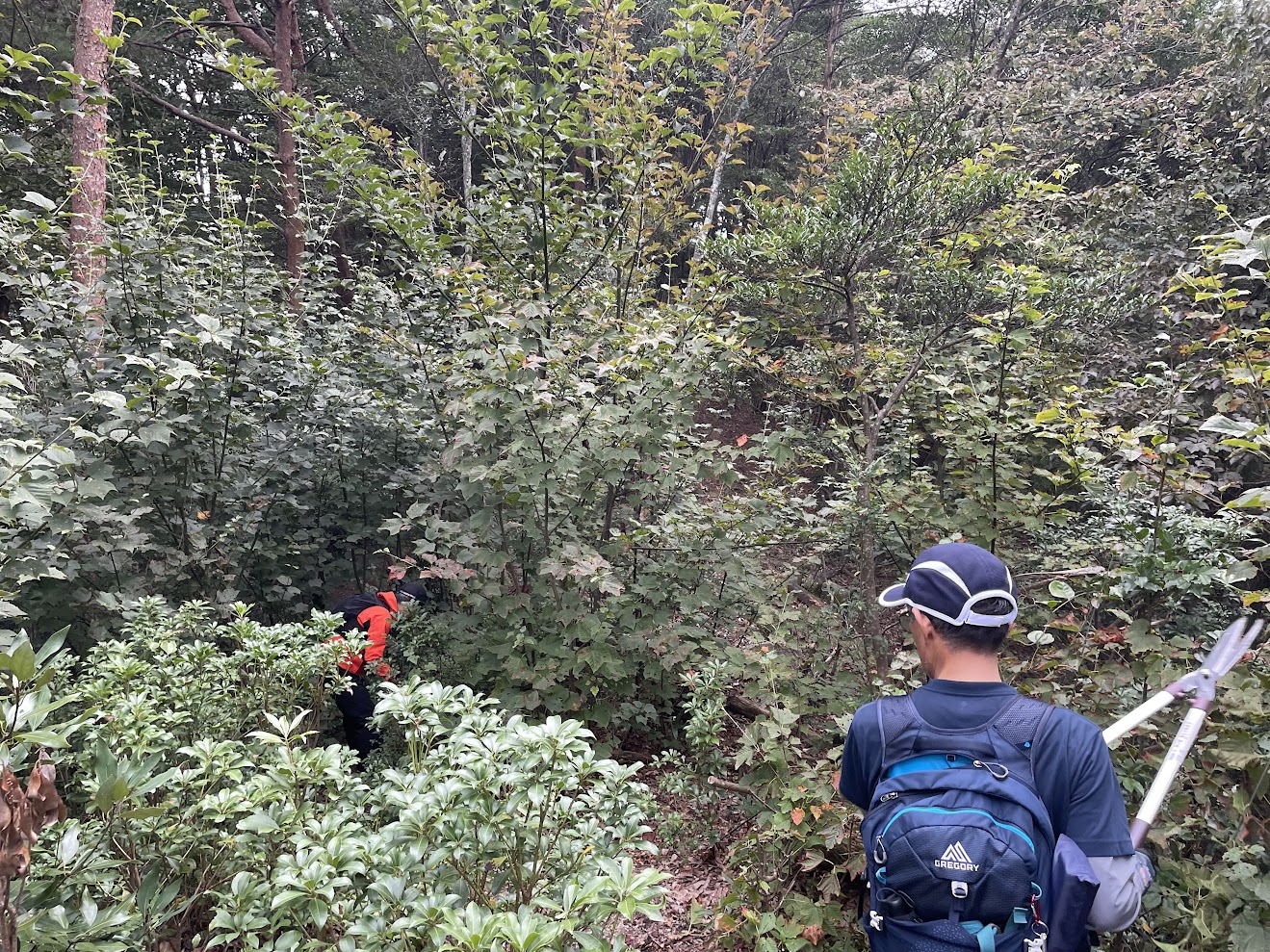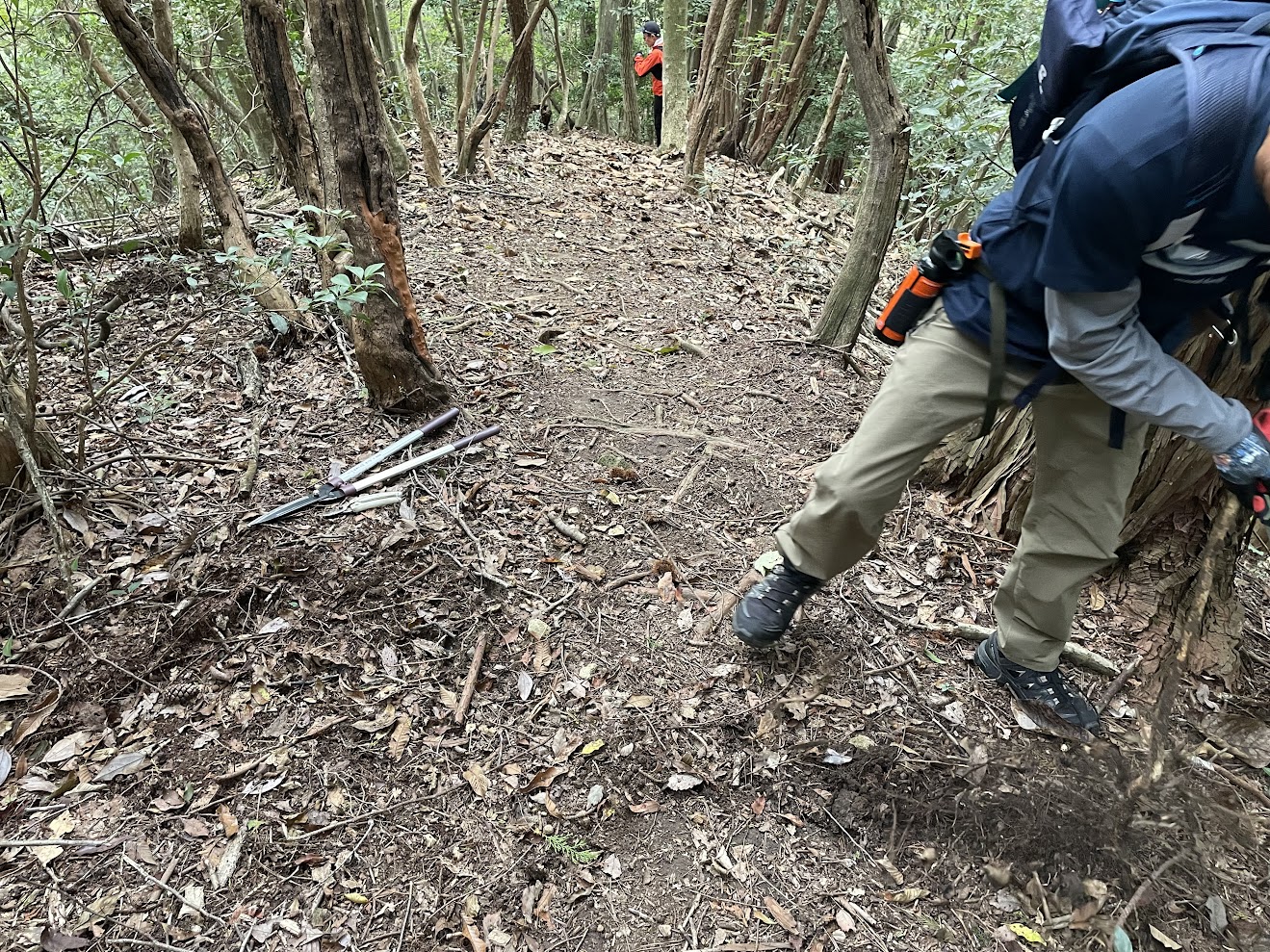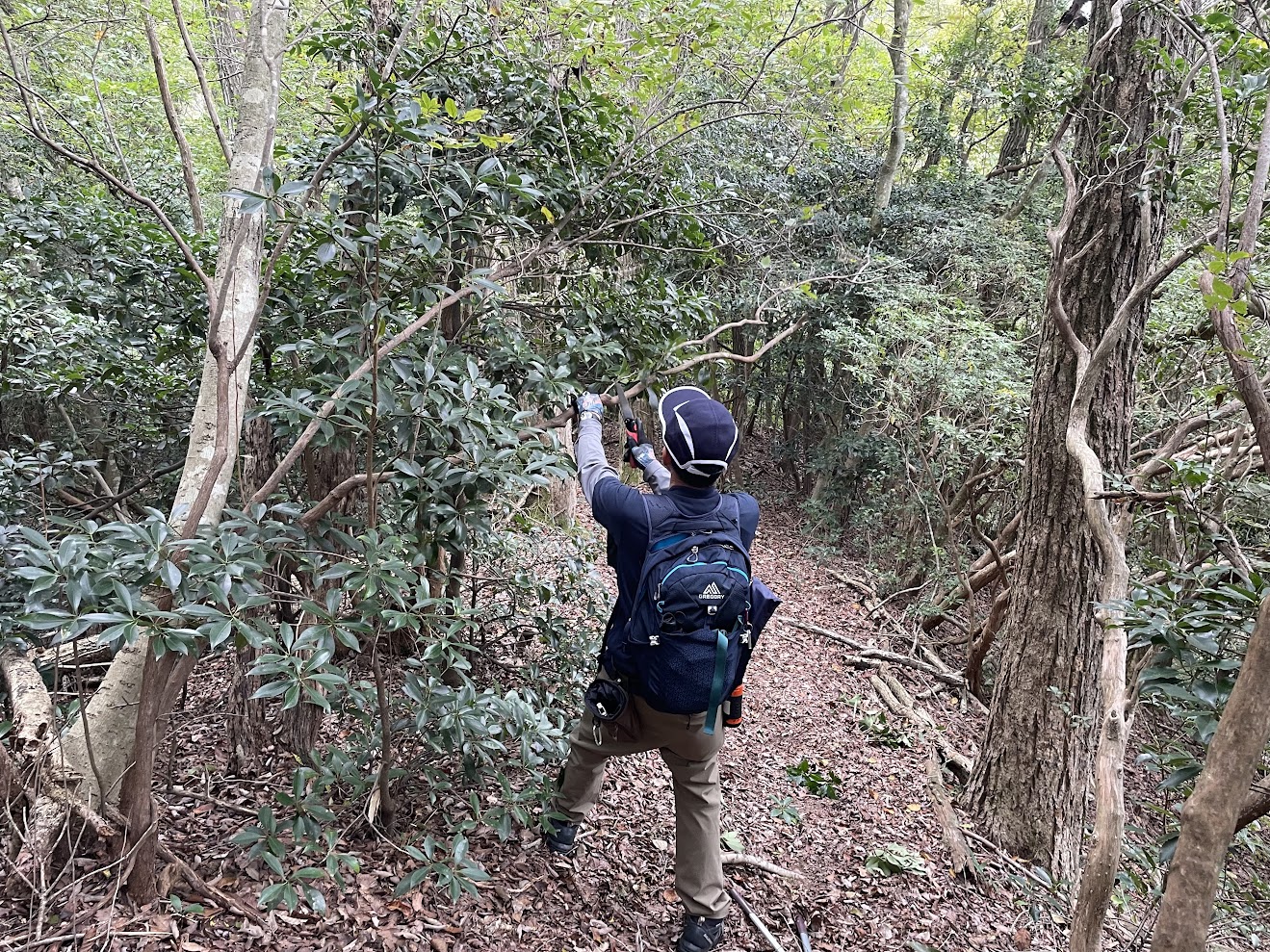 シダや笹が茂るスポットはほとんどないけれど、木立の間の道がどこも通れそうだったり、逆に、枝葉が張り出して道が見えにくいところがあるため、道の両脇や頭上の枝葉を刈り込んで見通し良く道を整えていきます。