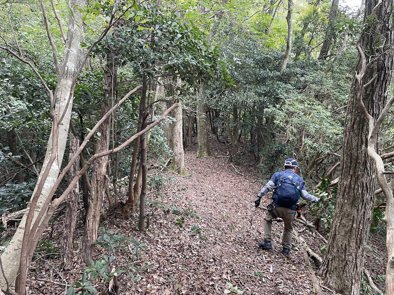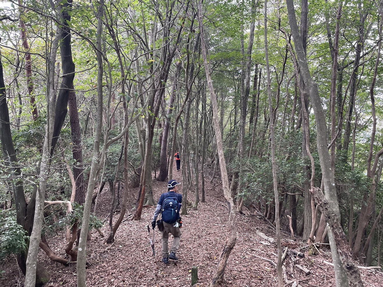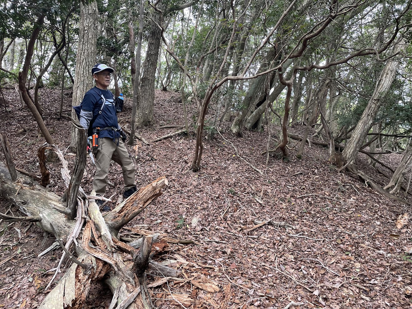 先頭のKさん。デビュー整備が古観音山の防災道路の倒木祭り、続いて灰ヶ峰の笹海討伐と一年のなかでもかなり重量級の整備が続いたため、サクサク歩きながらの整備に、「こんなんでいいのかなぁ?」と(≧▽≦)