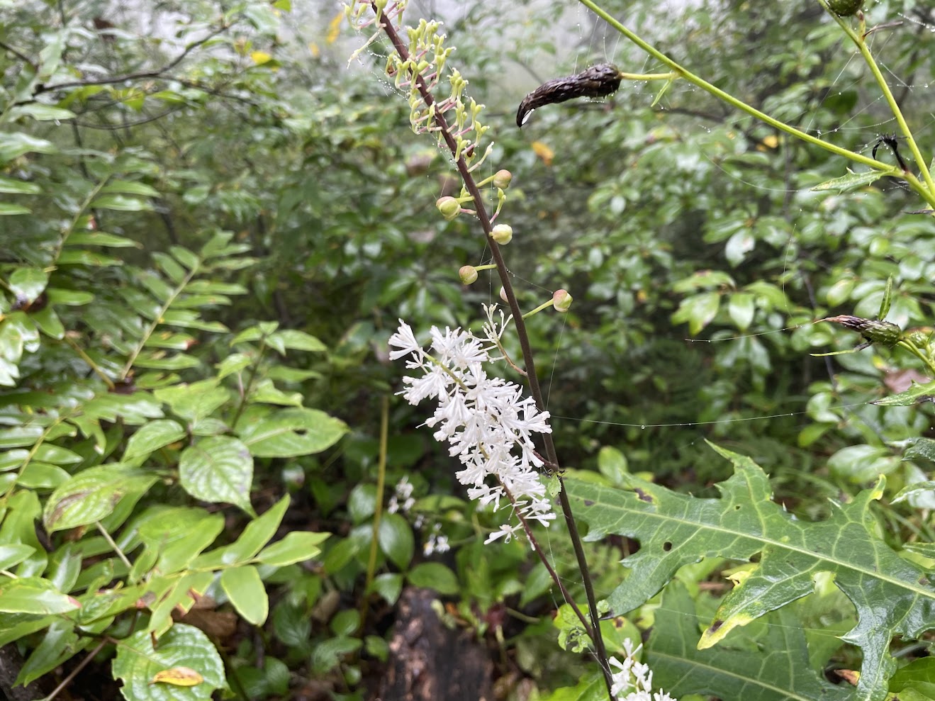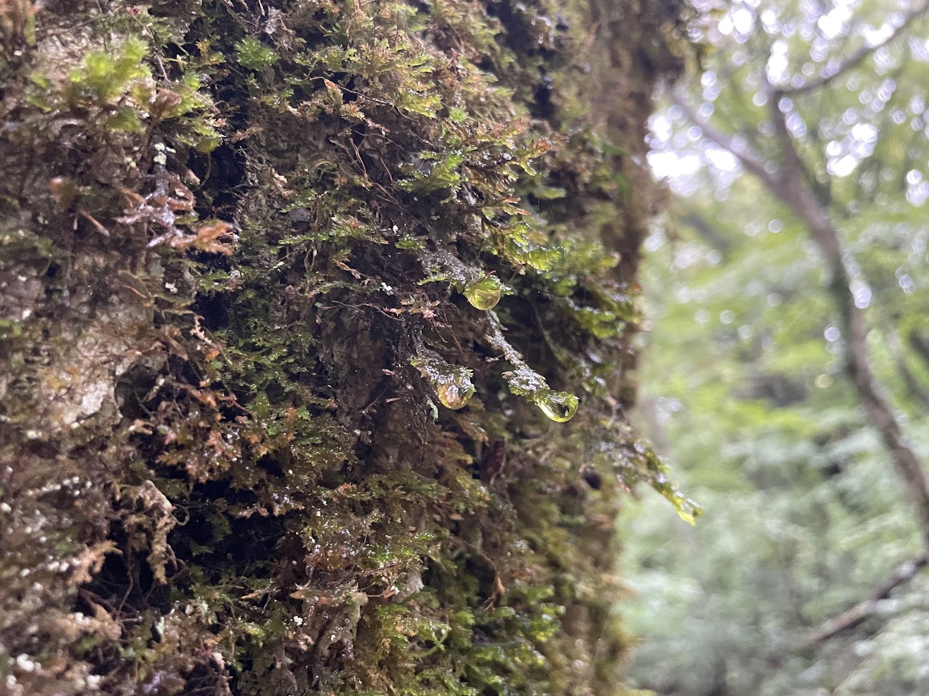 樹々は雫を湛え、霧に包まれた森は幻想的な雰囲気を醸し出しています。