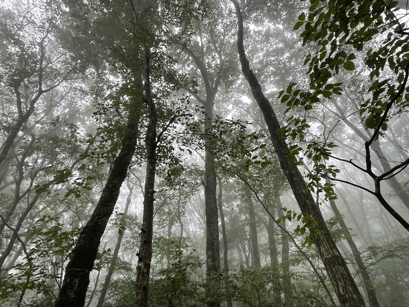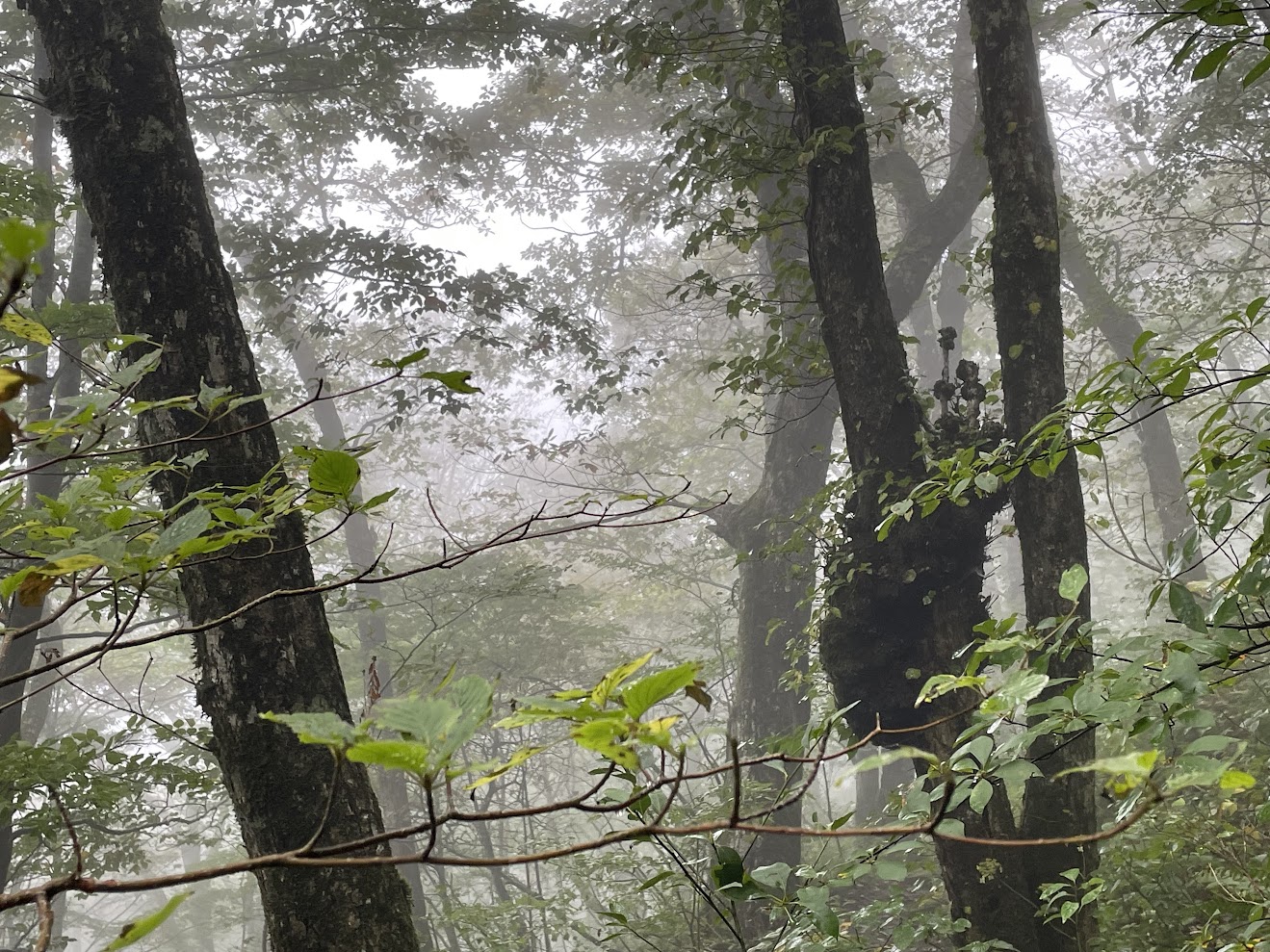 深い霧のなか、木の幹に均等でない膨らみを見つけると、「え?クマが木にしがみついてる?」そんな錯覚も。