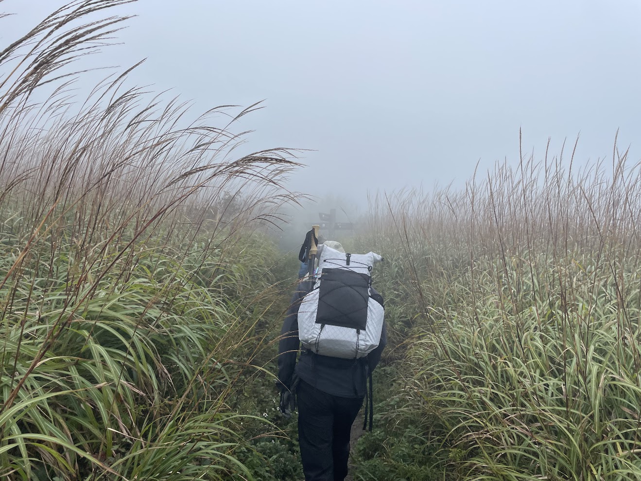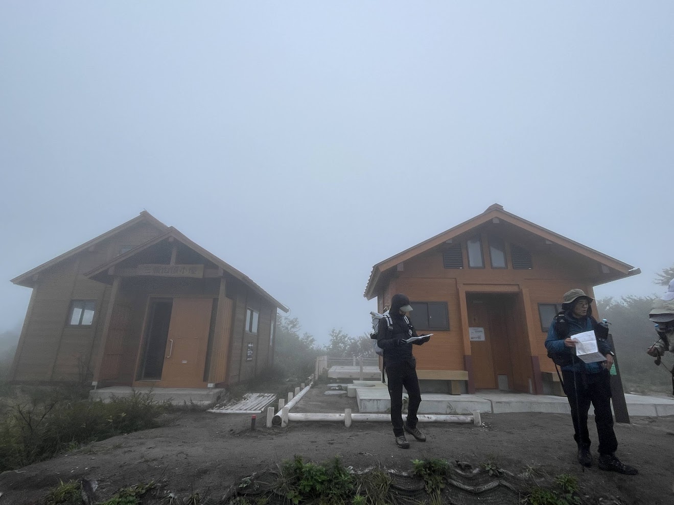 霧に包まれた中では、避難小屋も10数メートル離れたらあっという間に見えなくなり、視界が悪いなかでの山行のリスクを実感します。