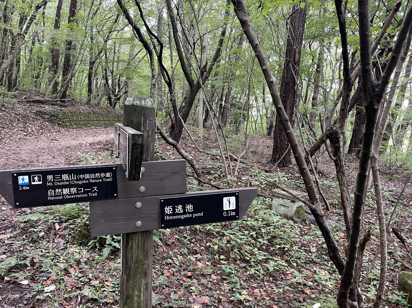 庭園道に出るまでの分岐まで、標高差から計算すると1時間弱くらいかな、との目算。しかしながら、下りとは言え段差が大きく足場が悪い急こう配の下りなのでもう少しかかるかもですね、とアドバイス。