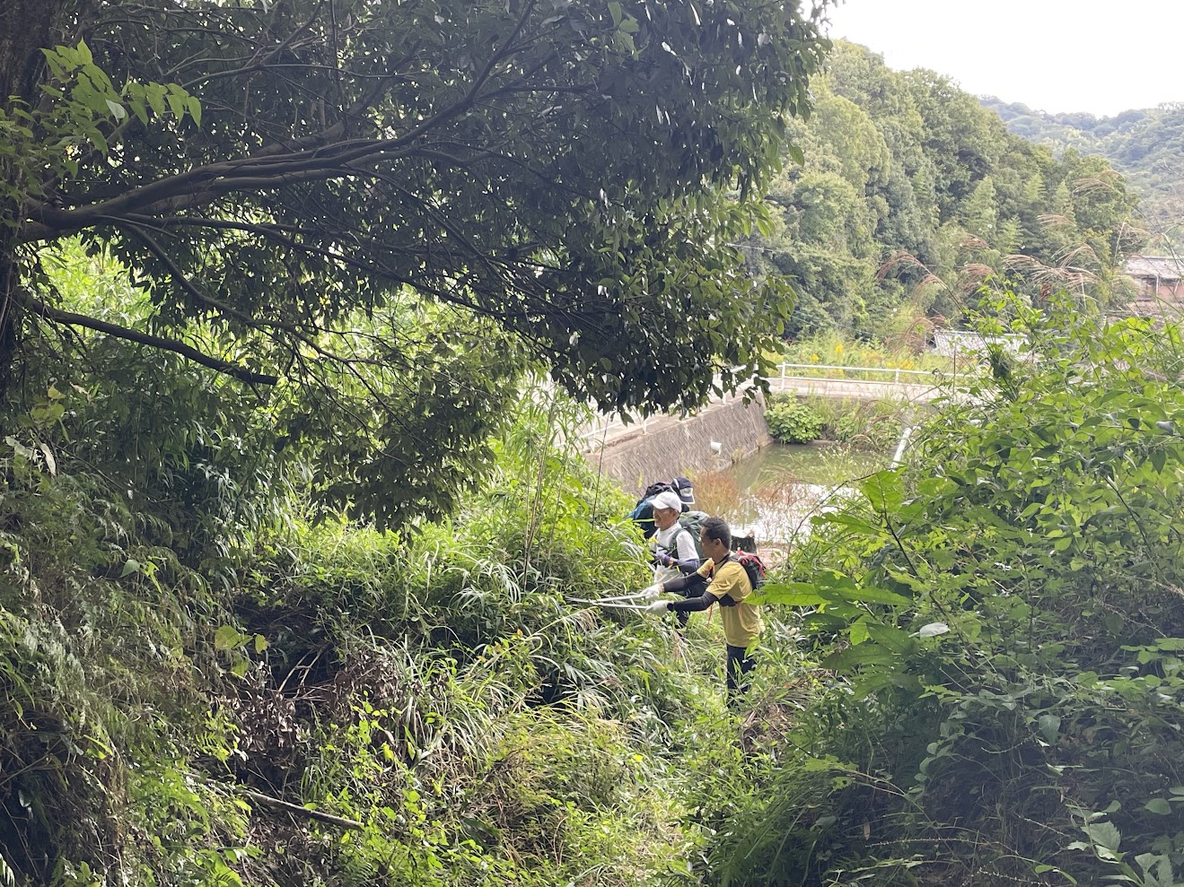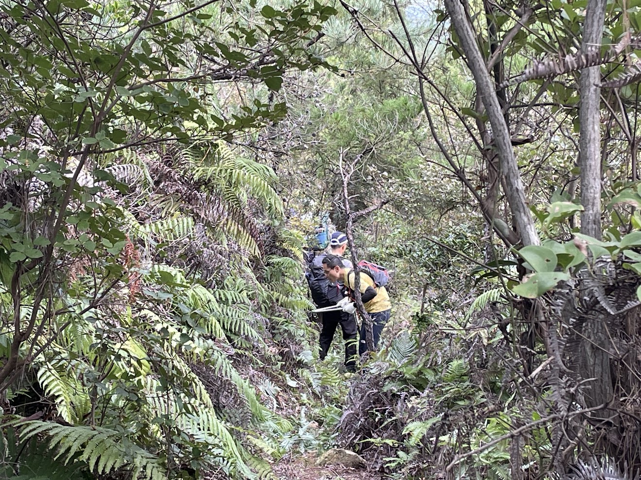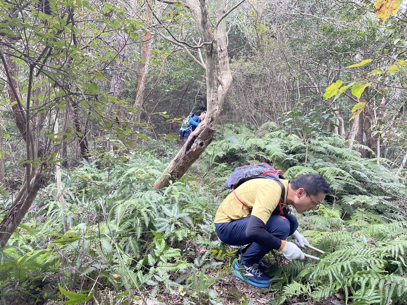 背が高いMさん、足元のシダをしゃがんで丁寧に刈ってくださっています。