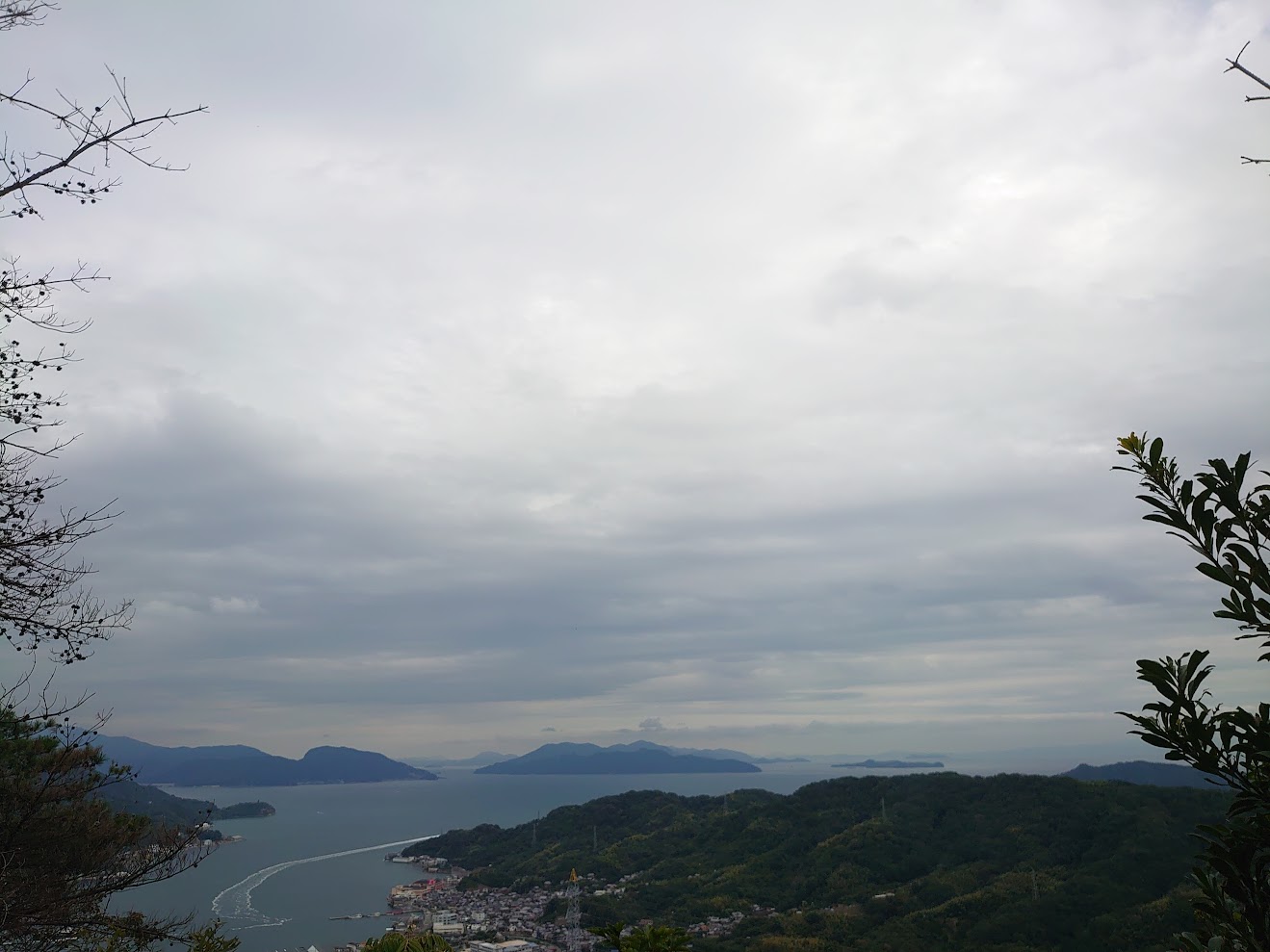曇り空、重たい海の色に、白い航跡。