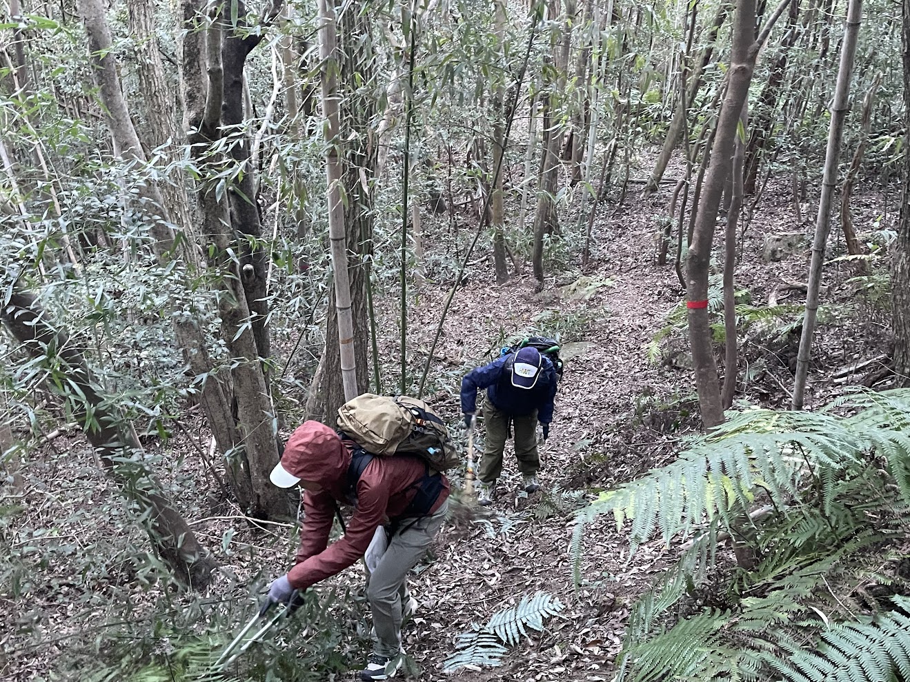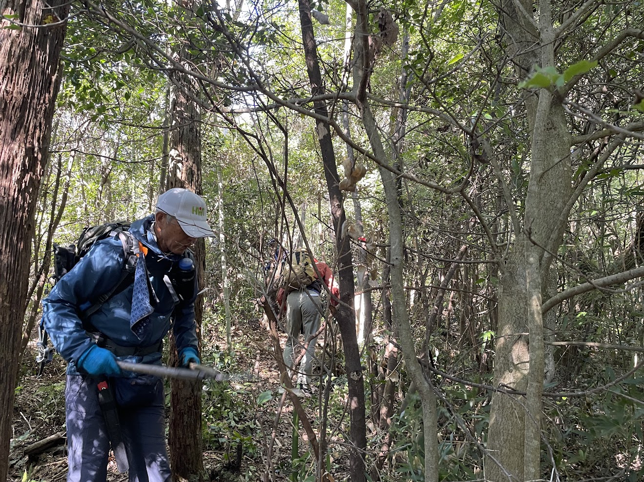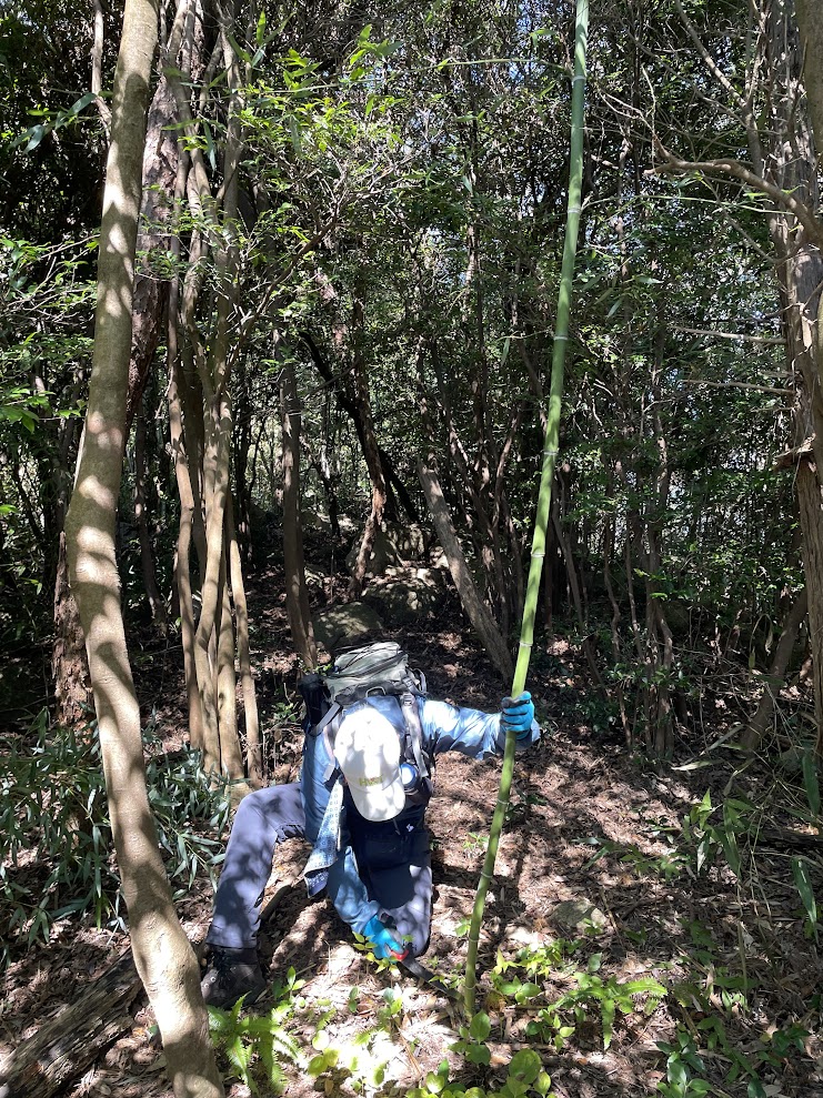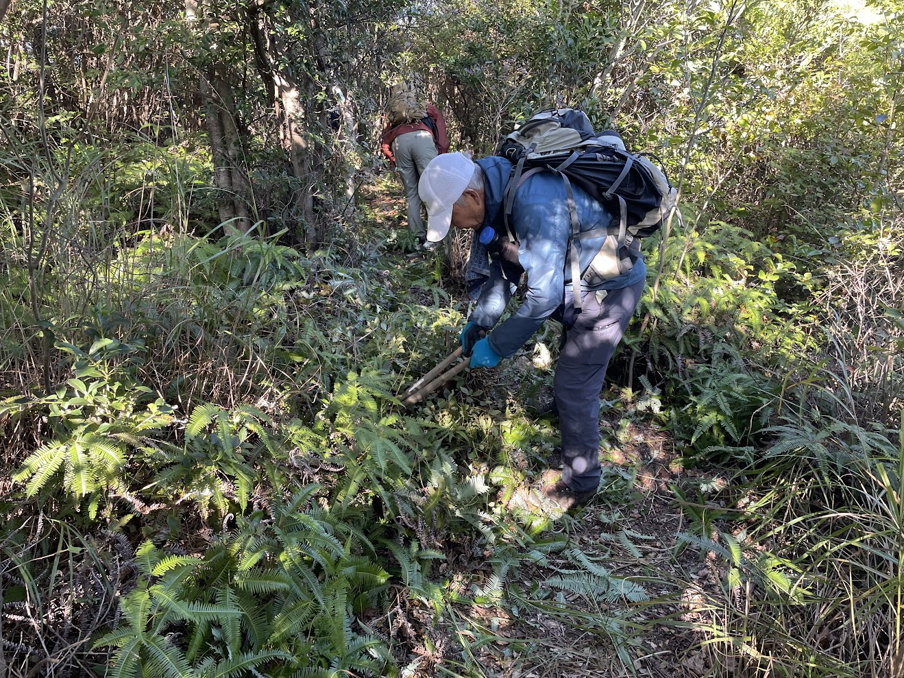 となると、防災路に出ずにトレイルは続いているはず!「道はありませんか?!道は~?!」と叫ぶM。道の痕跡に向かって細竹を刈り進むKさん!