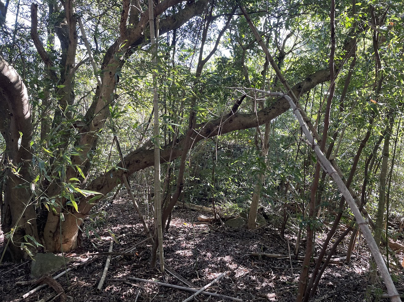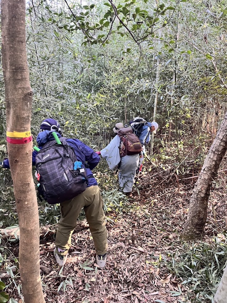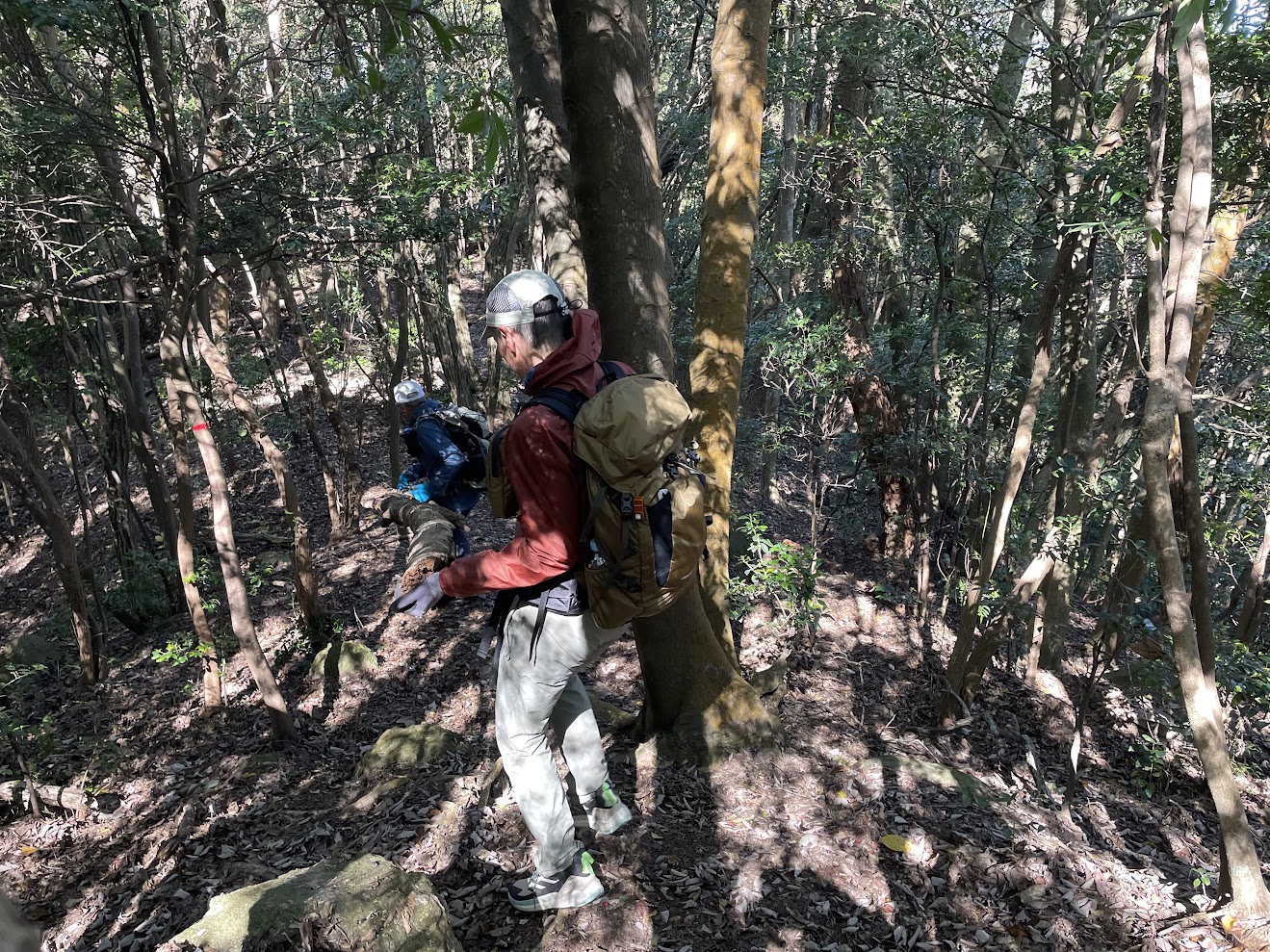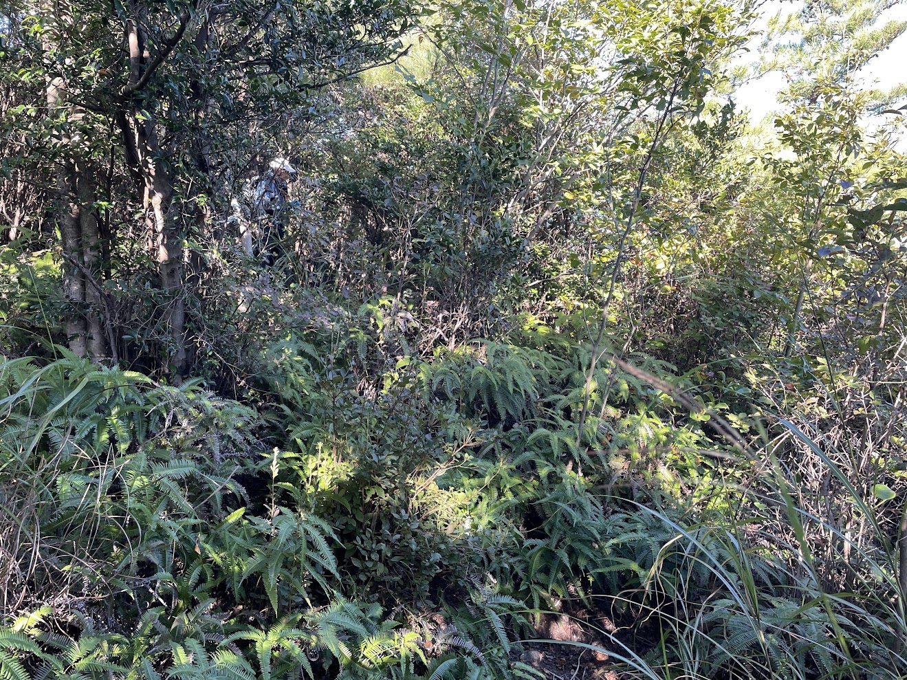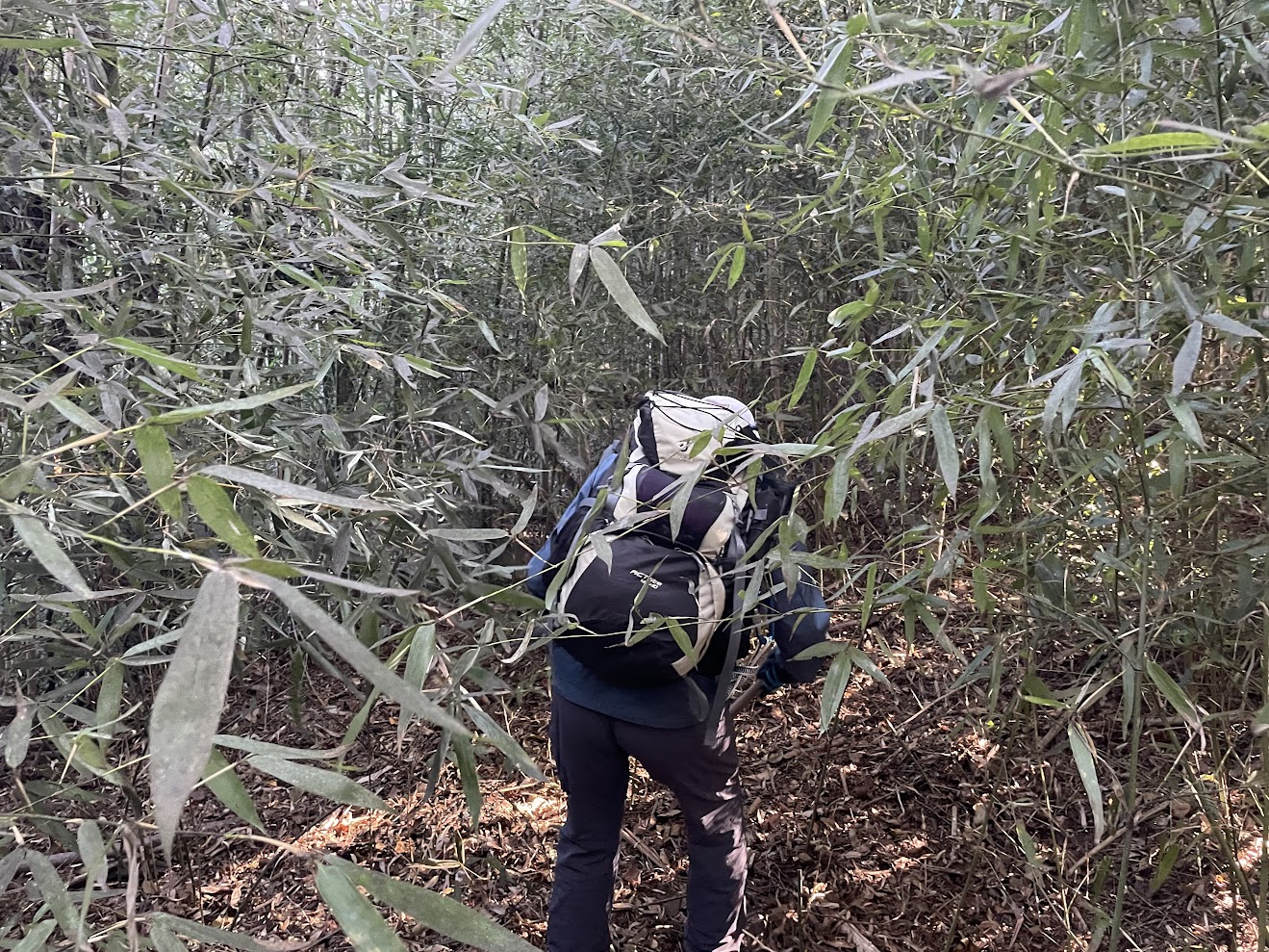 となると、防災路に出ずにトレイルは続いているはず!「道はありませんか?!道は~?!」と叫ぶM。道の痕跡に向かって細竹を刈り進むKさん!