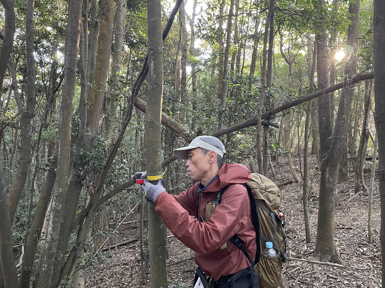 この道は、日当たりがあまり良くないせいか細めの木立が続き、その木立の枝葉が伸び、倒木落ち枝などで荒れた感じも強いため、道がはっきりしない…どこでも通れる感じがあり、整備と合わせてテープの貼り替えも慎重に行います。