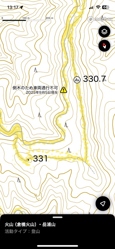 yamapに「倒木のため車両通行不可2025年9月5日現在」とあり、「果たして目的地まで乗り入れできるか?」戦々恐々…。前週土曜日も、こういった新規の倒木があることを懸念して登山口まで歩いた経緯があります。「車道の通行止め情報って、誰が車で走ったんかねー?」「イノシシ猟の人ー?」「イノシシ猟の人がyamap使わんじゃろー」と話しながら進みます。