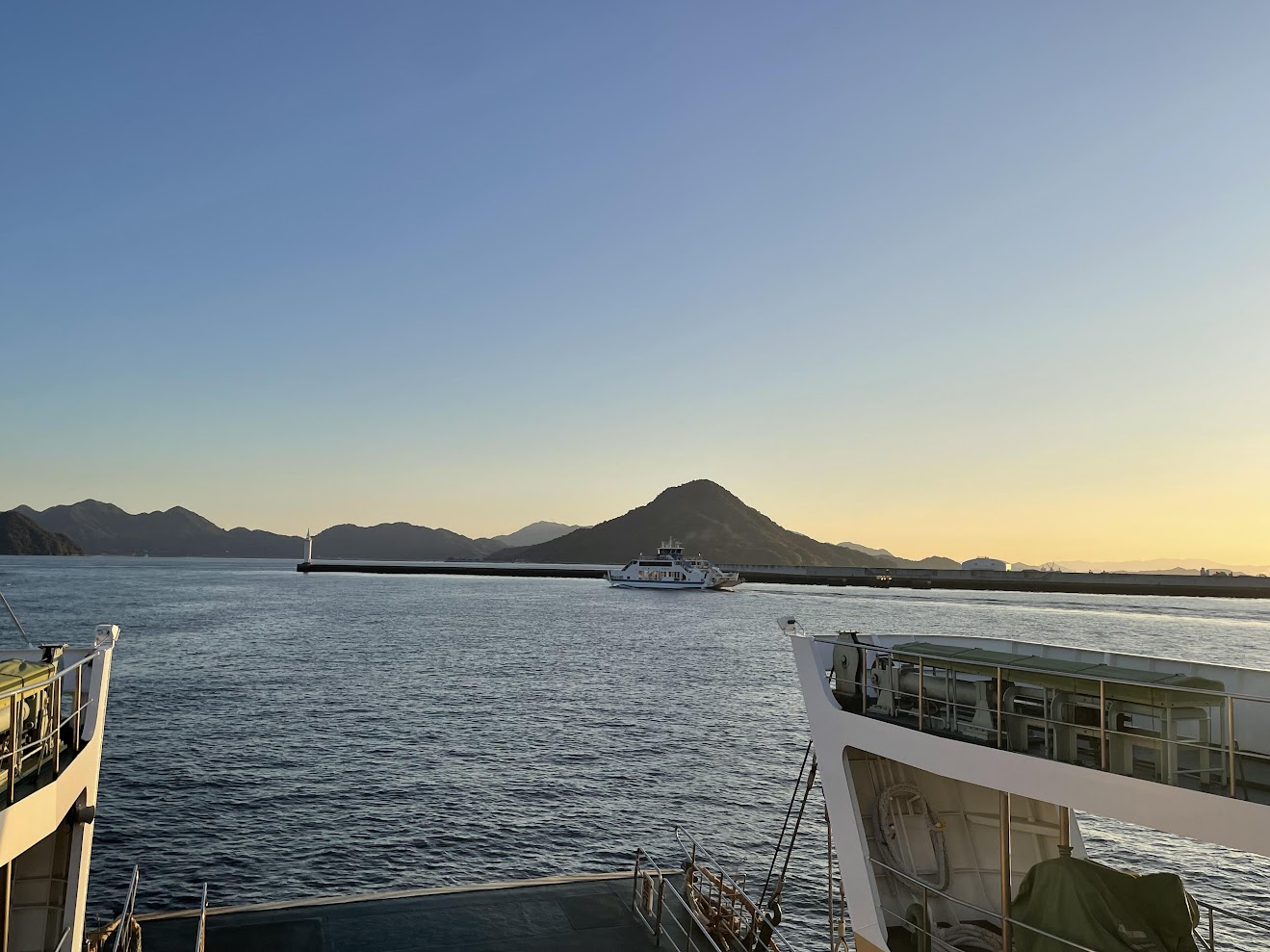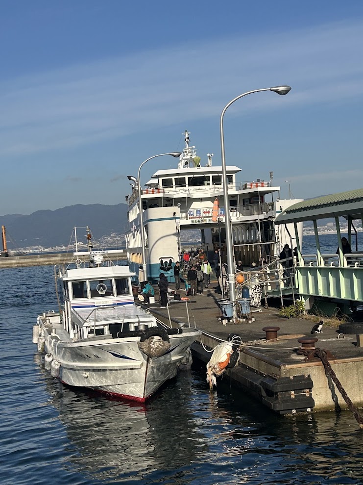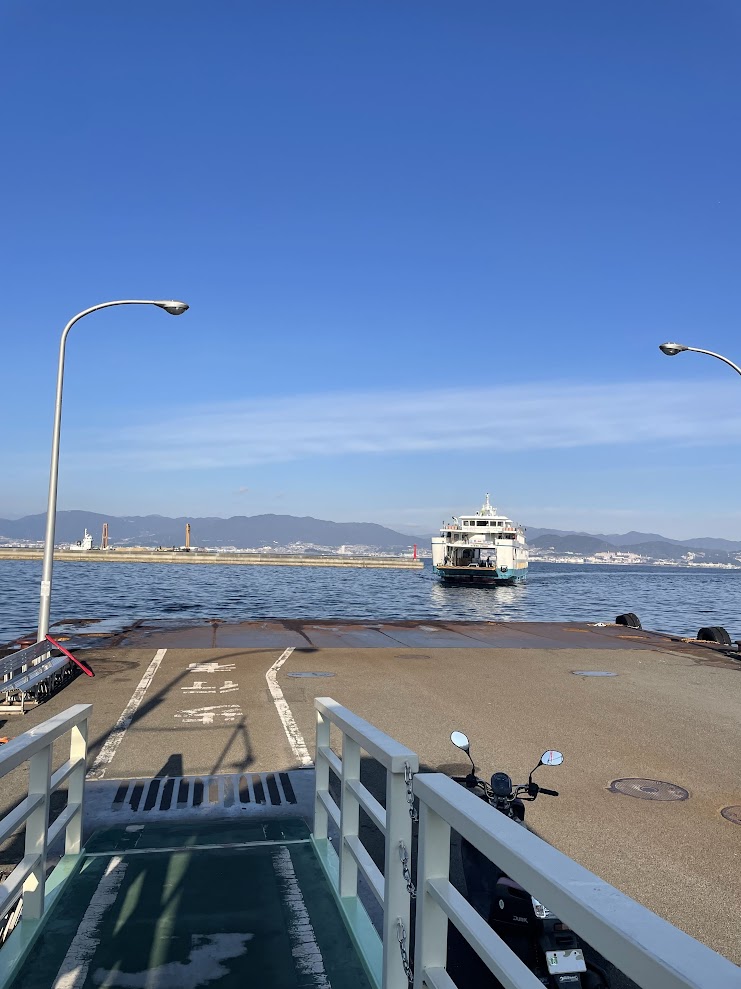 11/22(土)ひと足お先に似島入りする前泊組。6人がフェリーで海を渡り、ユーハイム似島歓迎交流センターへと向かいます。