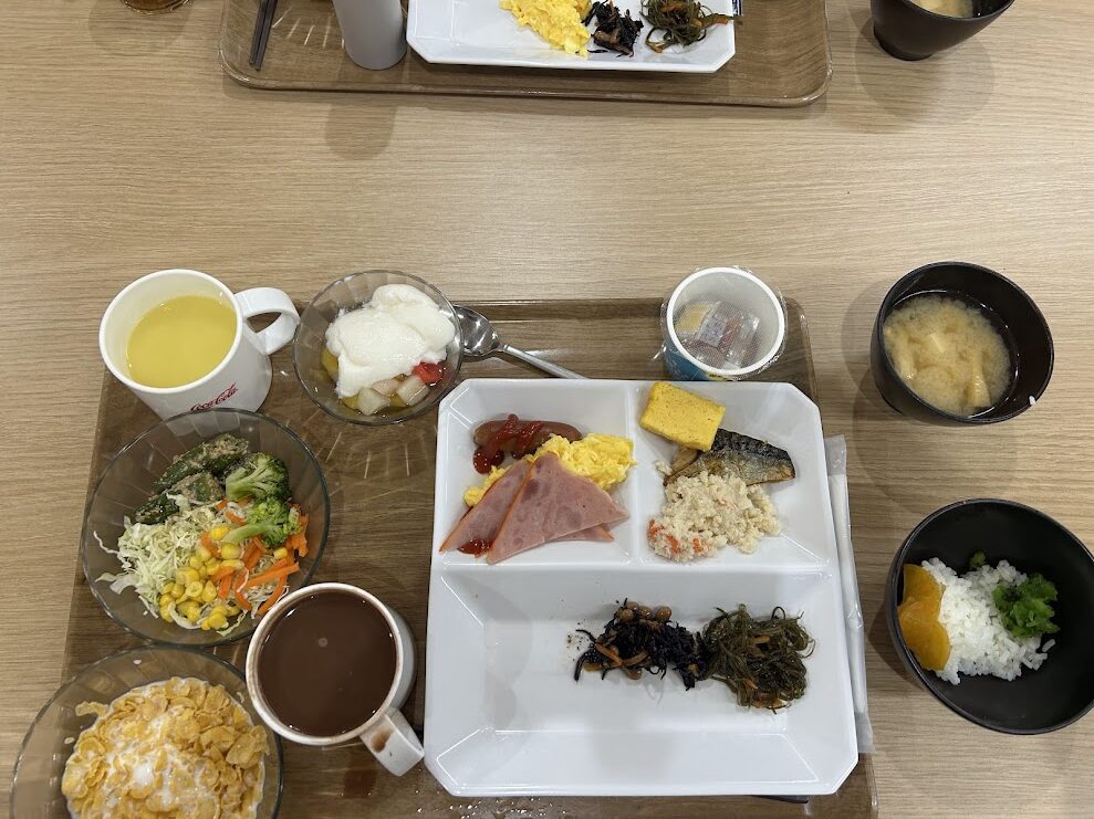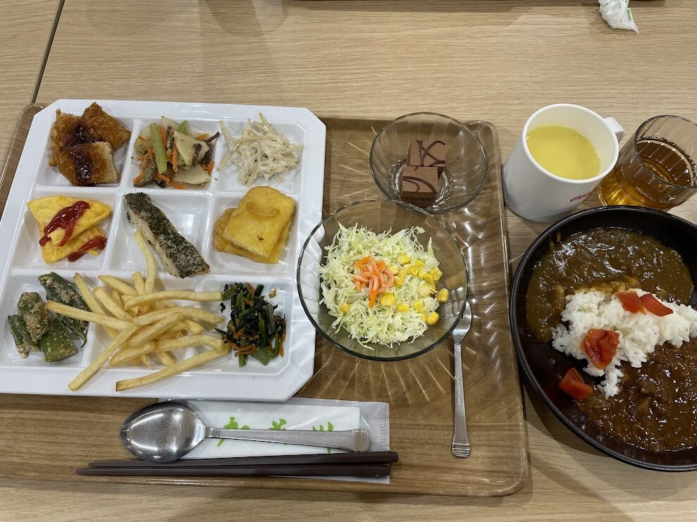 夕食は手軽なドリンクバー付きのプレートバイキングを食堂でいただきました。ごはんにはカレーやハヤシライスも選べておなかぱんぱんに♪