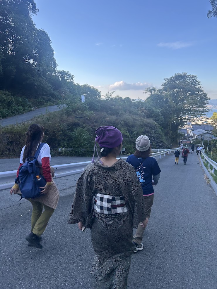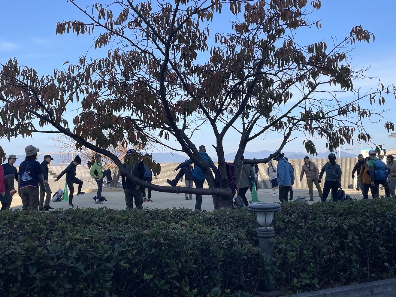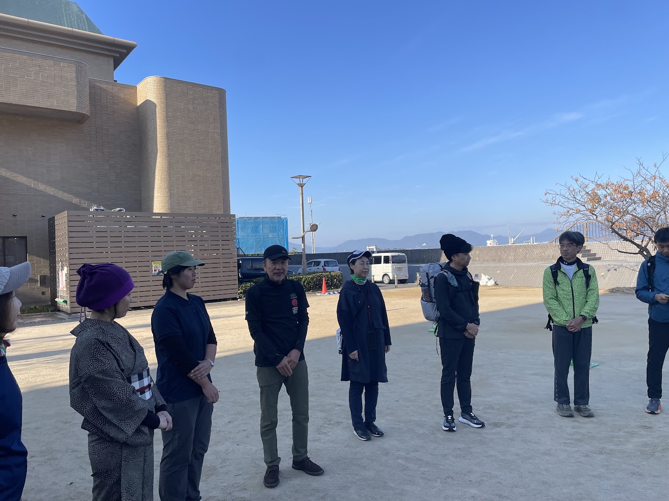 「ようこそ似島へ~♪」と島の住人よろしくお出迎え。お隣の公園で集合し、朝の挨拶。