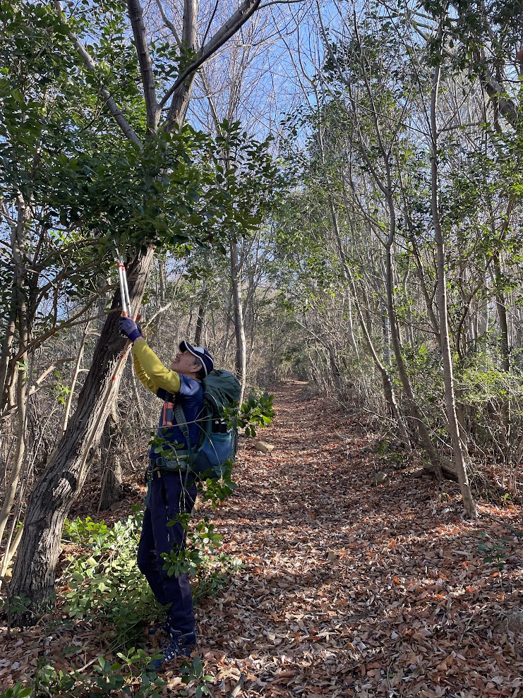 この日の整備は、単年で茂るシダや笹の刈り込みや倒木処理とは違って、トレイルが良い状態に維持されるよう、道幅や頭上の明るさ、見通しの良さを意識しての整備。さらに、初めての道具の使い勝手に慣れないこともあり、最初は考えながら整備されていたMさんも後半は上へ下へと鋏を向け、シャキシャキと軽快な音を立てて刈り込まれていました(≧▽≦)