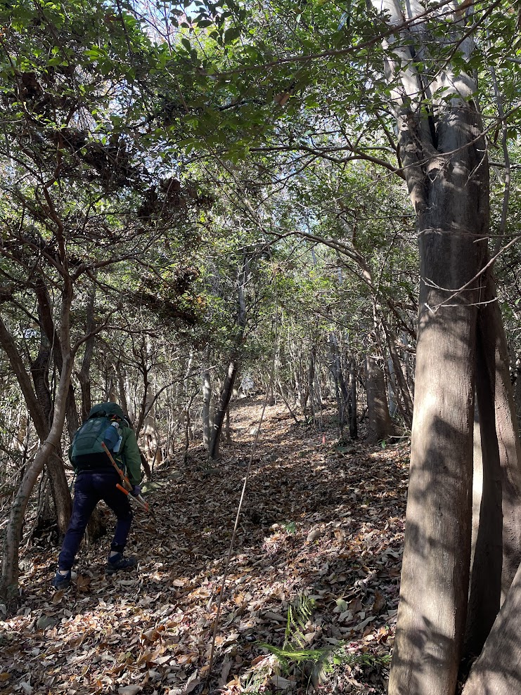 坂山からはひたすら下り。時間を気にしつつも、足場が悪く滑りやすい道を注意深く下っていきます。北側の斜面で日当たりが良くないため刈り込みはほとんど必要なく、概ねテープの貼り替え対応のみで整備完了、ゴール!