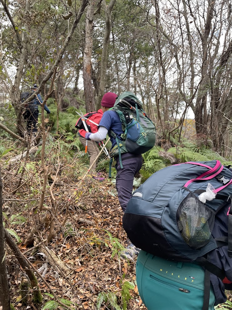 道を覆うシダを激しく刈り込む一行の姿が…。長いいちにちのはじまりです!