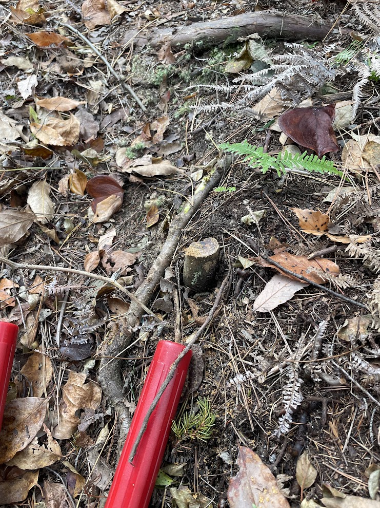 前回この道を整備したHさんが、足場を整えた眺望スポットを教えてくださいます。足元には刈り込んだ大量のシダと枝葉!