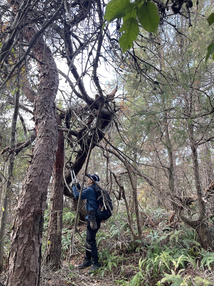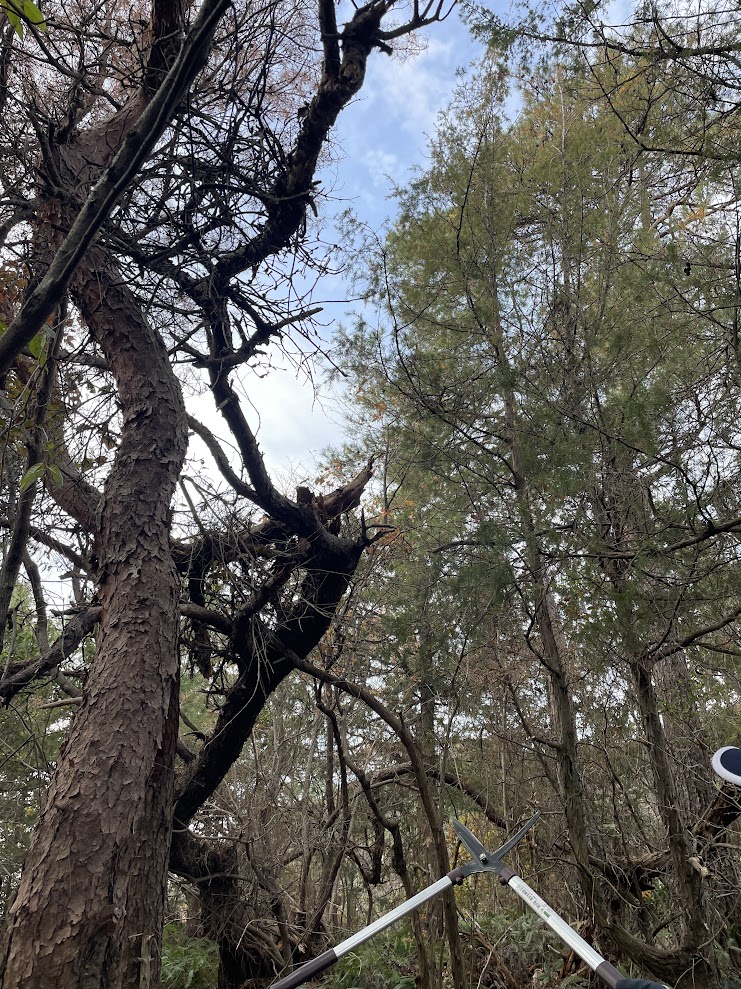 頭上の塊りは、対応する自分自身の安全にも留意しながら整備。蔓や枯れ枝を取り除いて整理します。