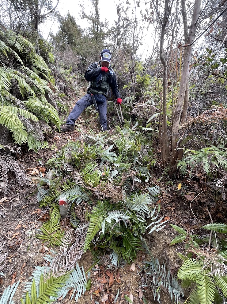 シダ、頭上の枝葉、足元の切り残しと、常に全方向に目を向け、危険物を取り除きます。