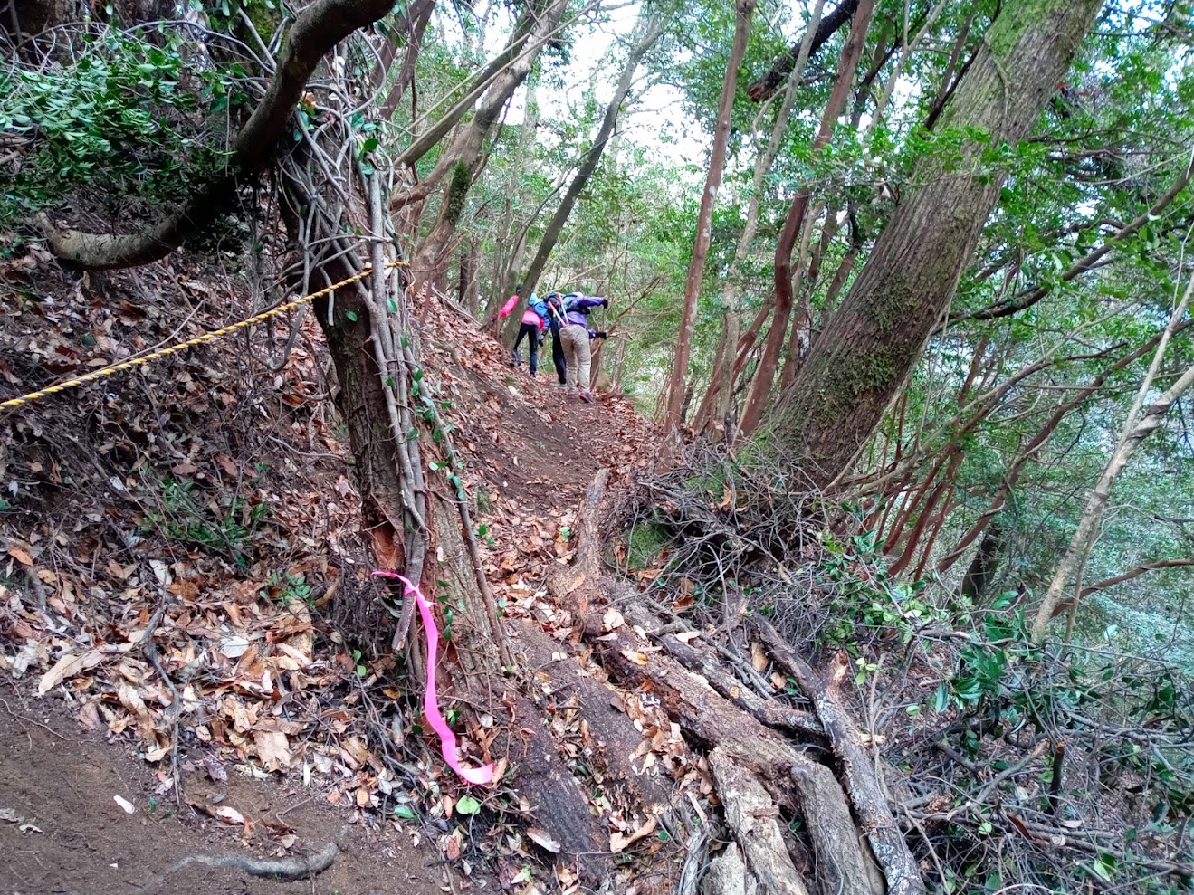 ピンクテープで注意喚起。右側の木を渡してあるところはまた改めて整備を加える予定です。