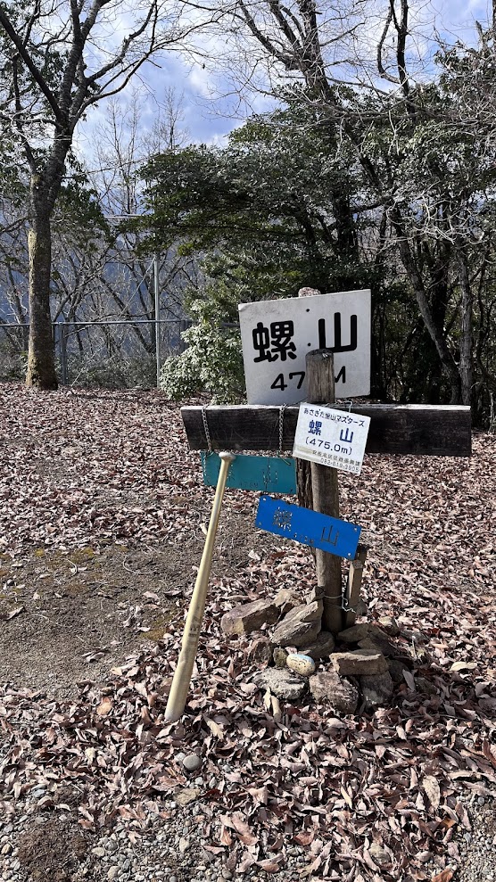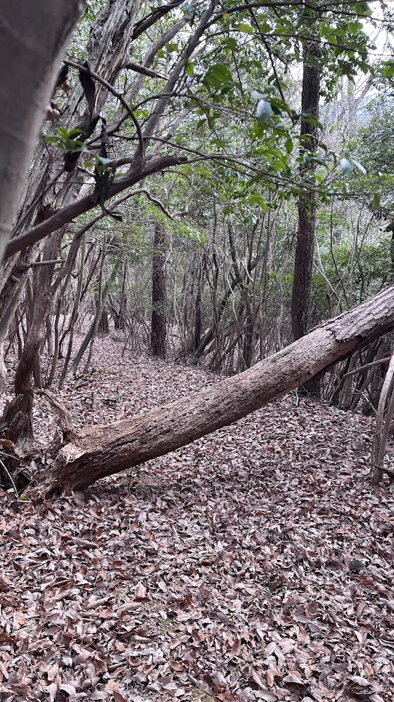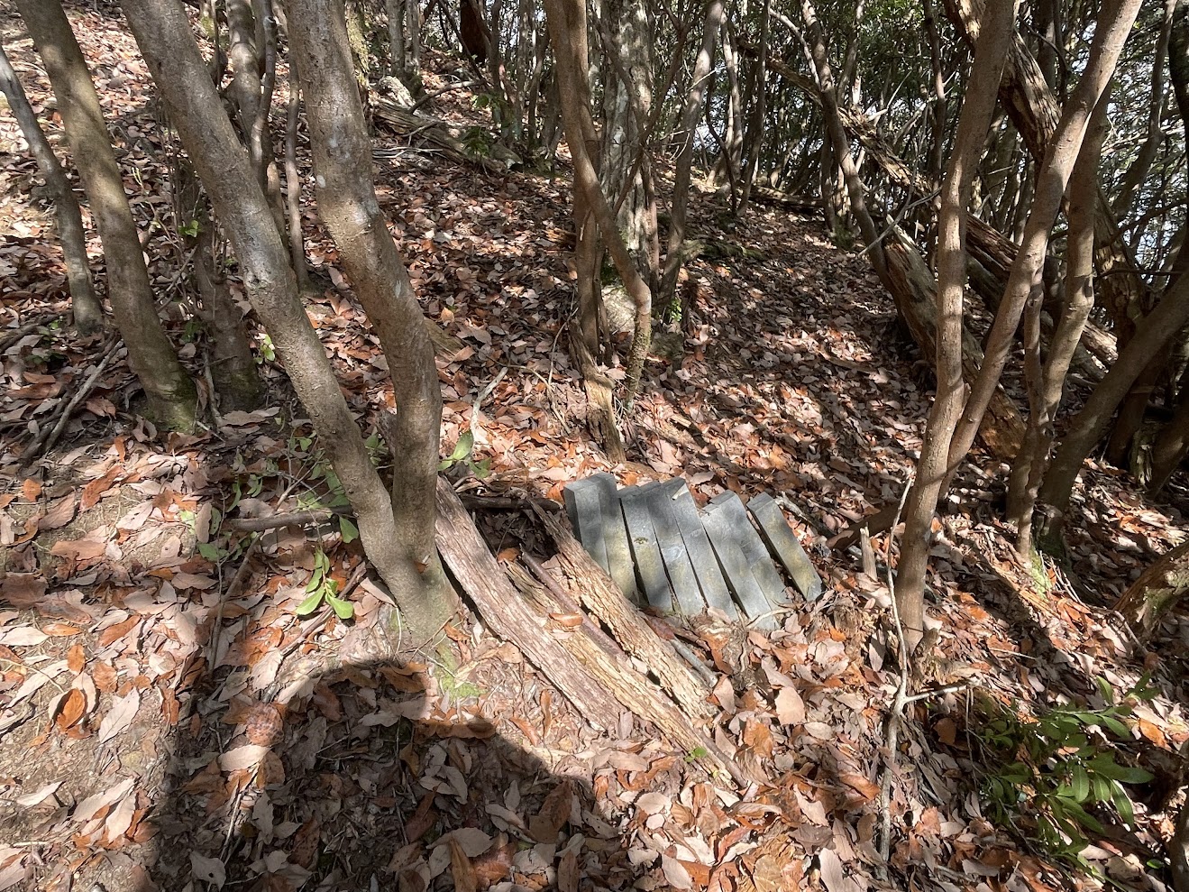 螺山の下山路は勾配がきついのに加えて落葉に杭や石が隠れていてかなり危険です。