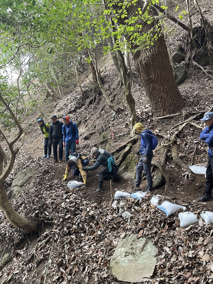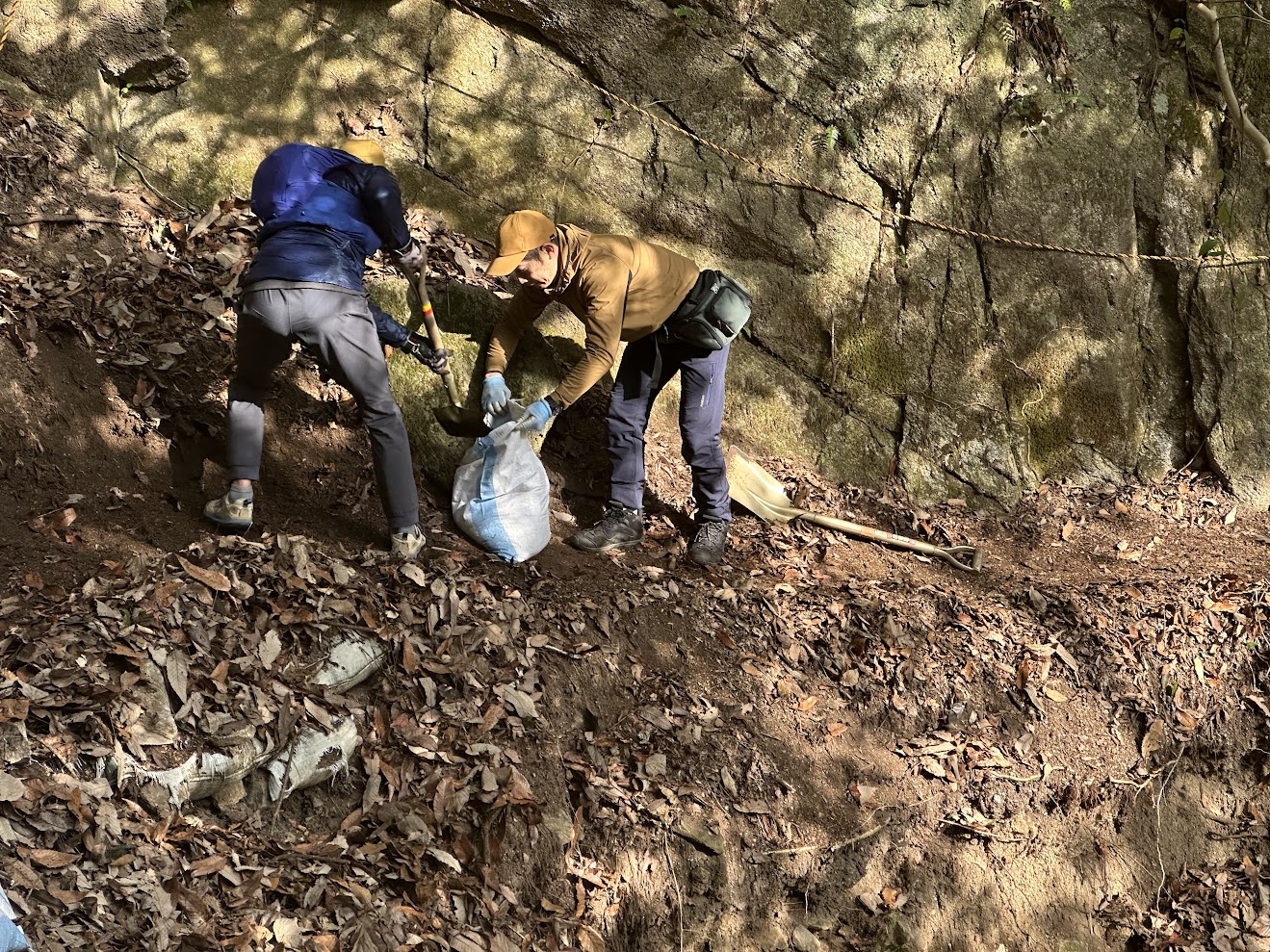 崖側は下手に触ると崩落を進めてしまう可能性があるため、落葉を掃く際も端を掃きすぎないようにしようと申し送り。
