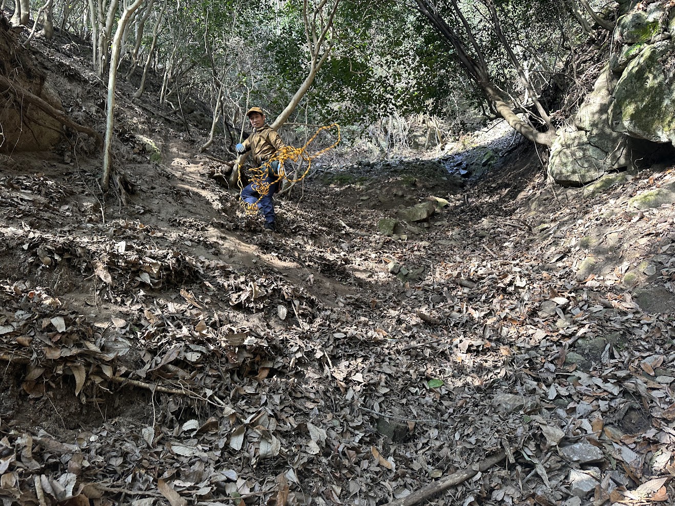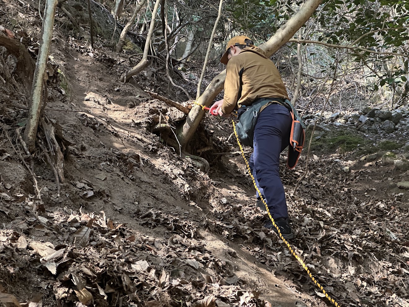 既設のロープもより安全に、と、中央部分を崖の上の木から垂らしたロープに連結します。講座で習得したロープワークを現場で実践するOさん!