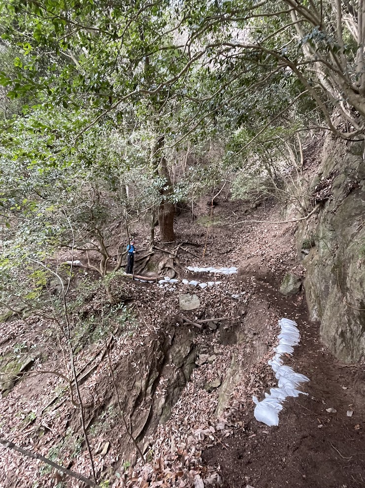 谷筋の斜面についた道は時間とともに細くなっていき、普通に歩いても冷汗がにじむエリア。夜間トレイルランナーが走る時の足元が心配…。そして、今後将来に向けて道は存続できるのか?