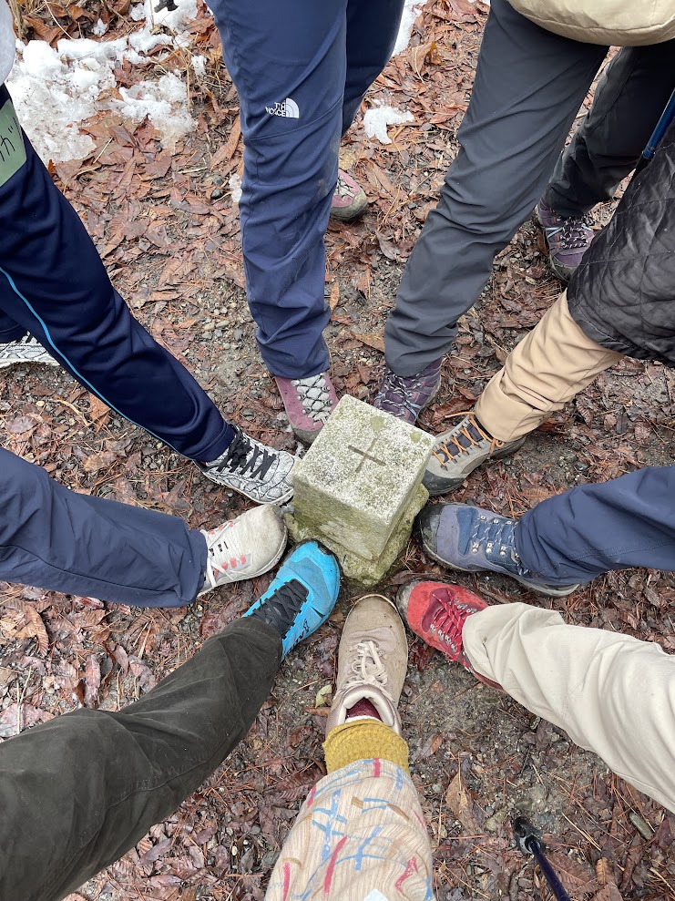 丸山山頂。二等三角点を囲んで「ひさしぶりにやっとく?」な集合写真。木立の中には残雪が。