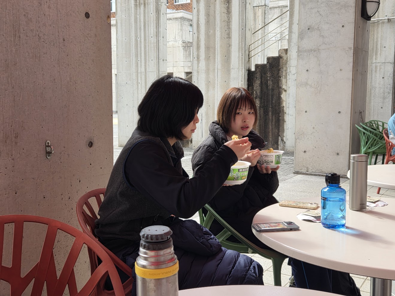 大学はすでに春休み。学食行きたかった~と残念がりながら、カフェの屋外のテーブルをお借りしてランチタイム。持参のお弁当に参加賞のカップ麺を足しておなかいっぱい♪