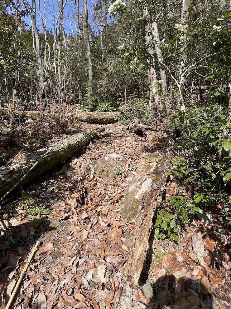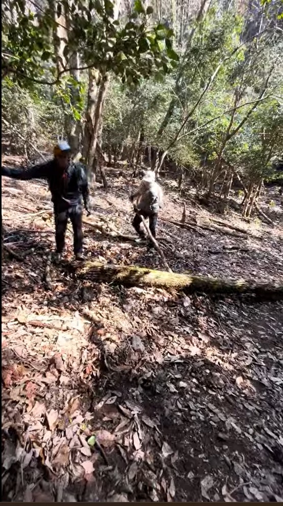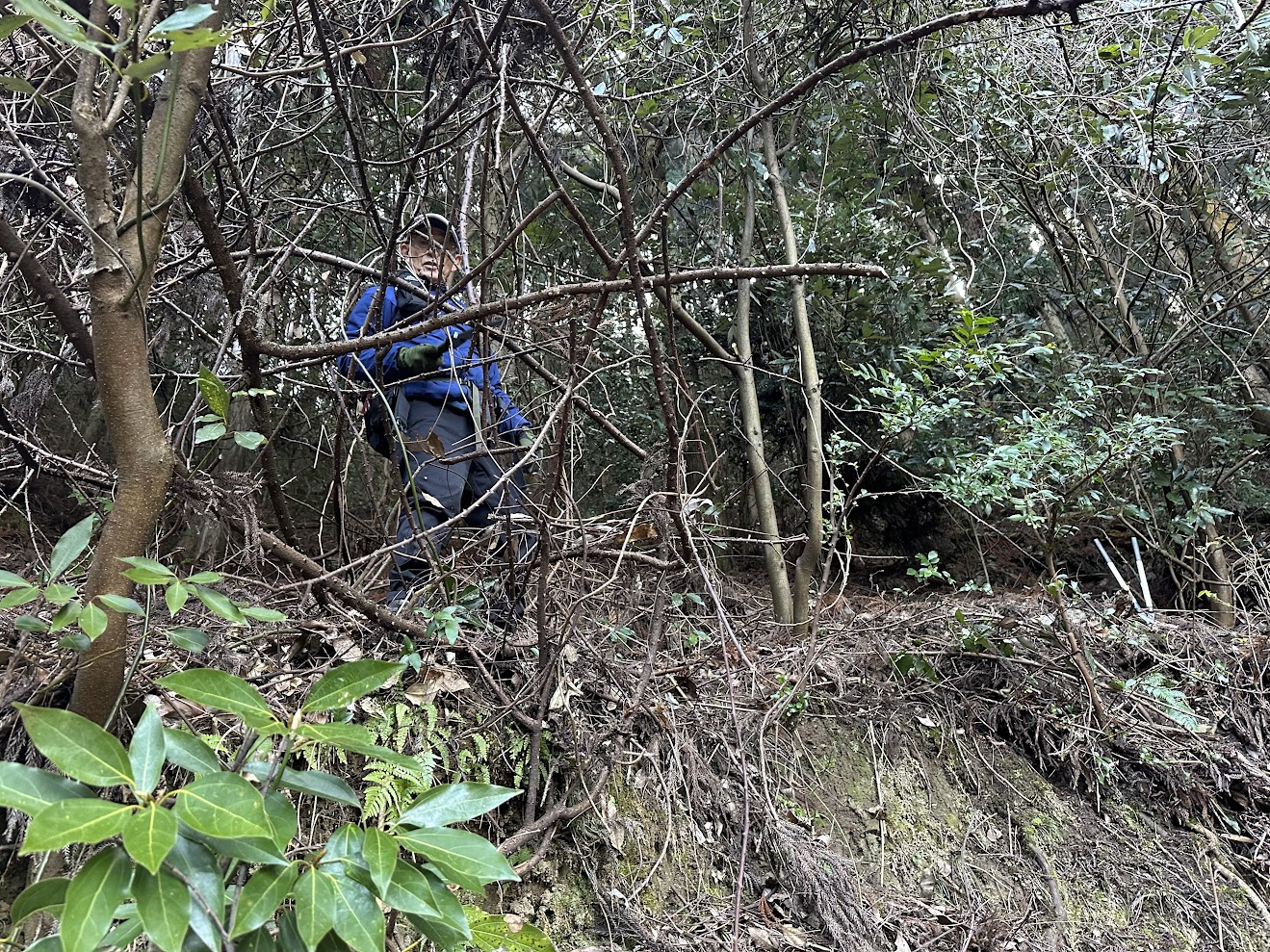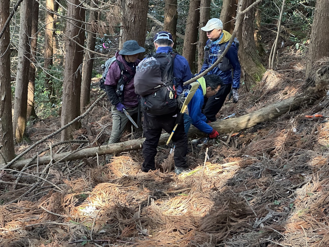 倒木を除け、シダを刈り、枝を落とし、折れた倒木が道の脇の木に引っかかって頭上に渡って宙に浮いてるのをなんとか落としたりしながら進んで行きます。