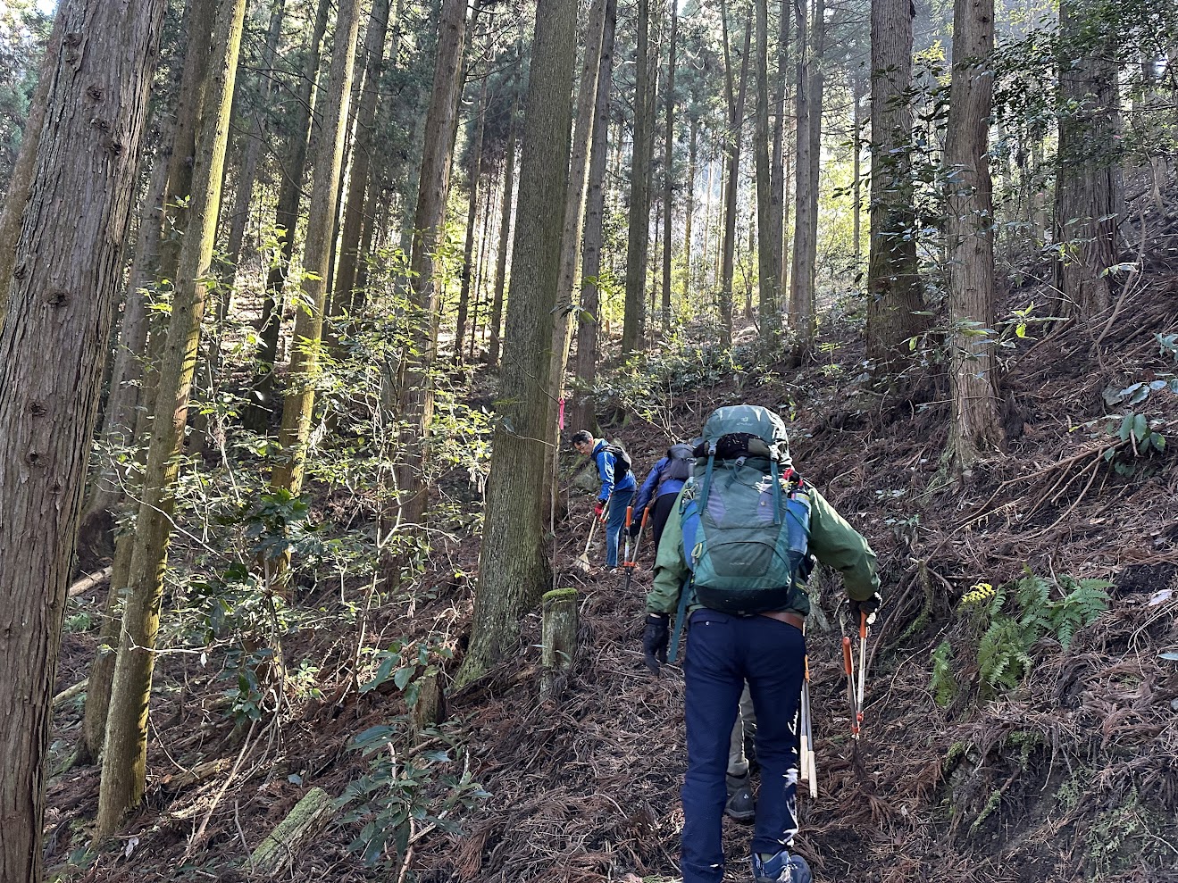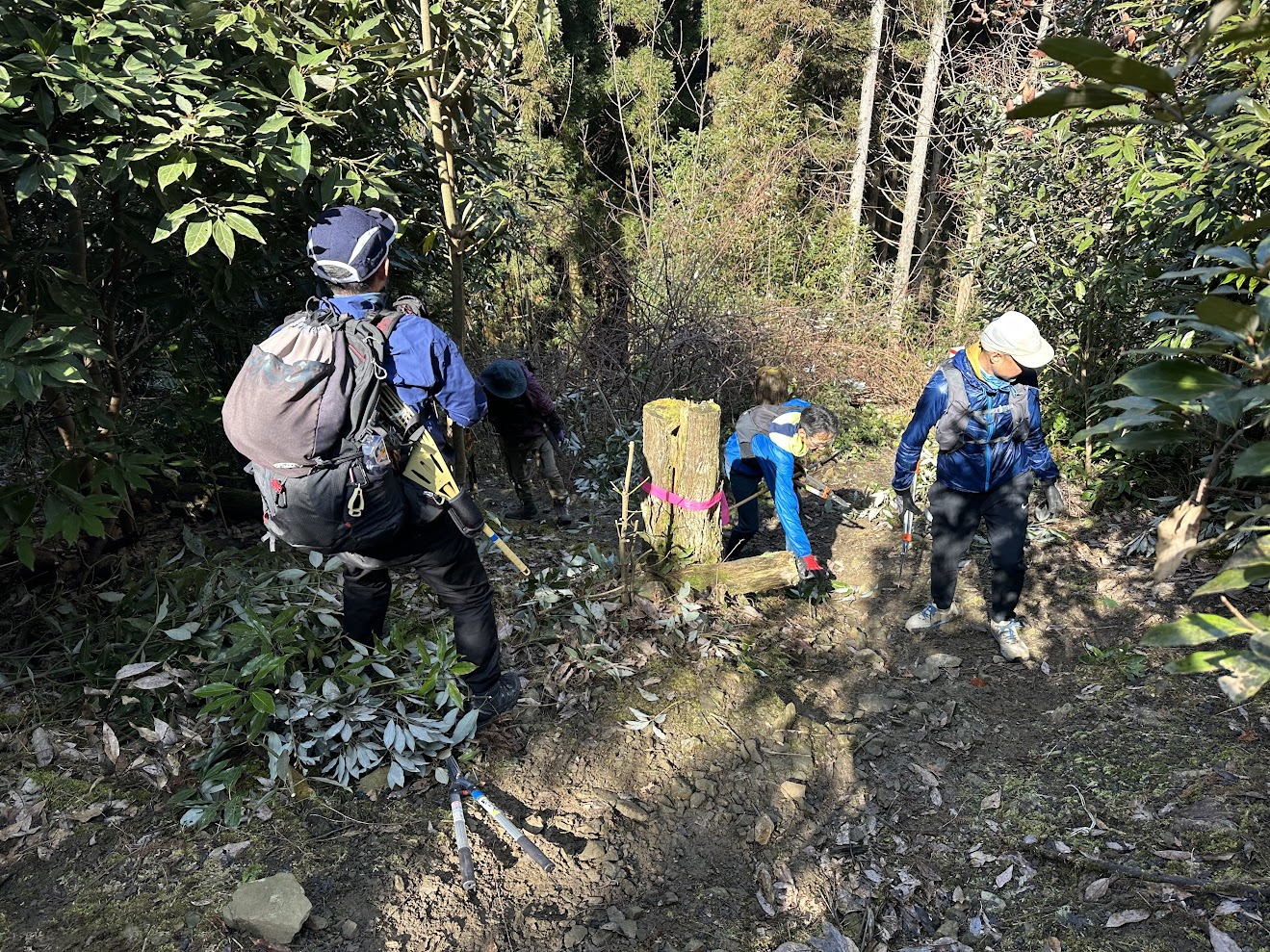 沢沿いの道は、道が細い箇所は山側の落ち葉を払って道幅を確保しながら進みます。沢を渡る箇所ではテープの貼り替えをしっかり。