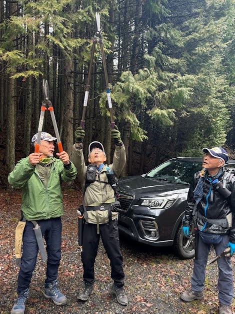 熊の生息エリアということで、「熊警戒発令中!」のT会長に先頭をお任せします。熊スプレーを携行しての活動となるため、刈り込みなどは後続メンバーに指示をいただき、出来るだけ皆の間隔が開かないよう、また、出来るだけ一カ所に留まらず進みながらの活動となるよう声かけしあうことを確認しあってスタート。