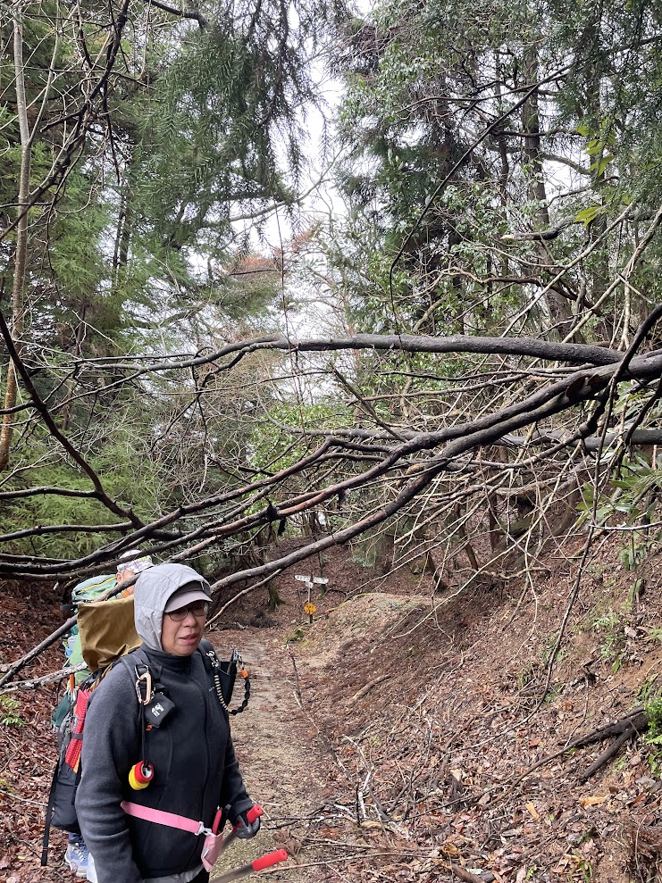 10歩も進まないうちに、進む気満々のメンバーの出鼻をくじく、道を遮る倒木💦