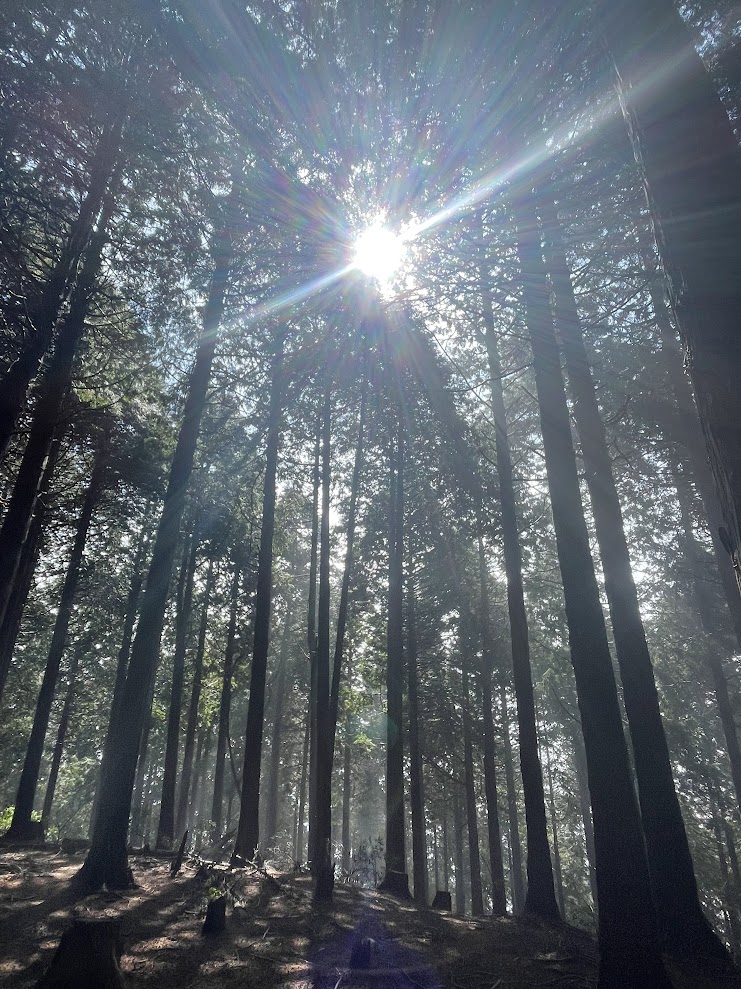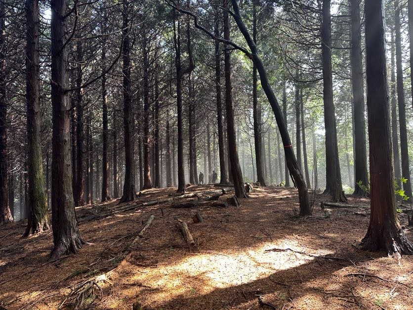 そんな杉の森の尾根道。雲間から陽ざしが差し込むと一気に幻想的な空気感。