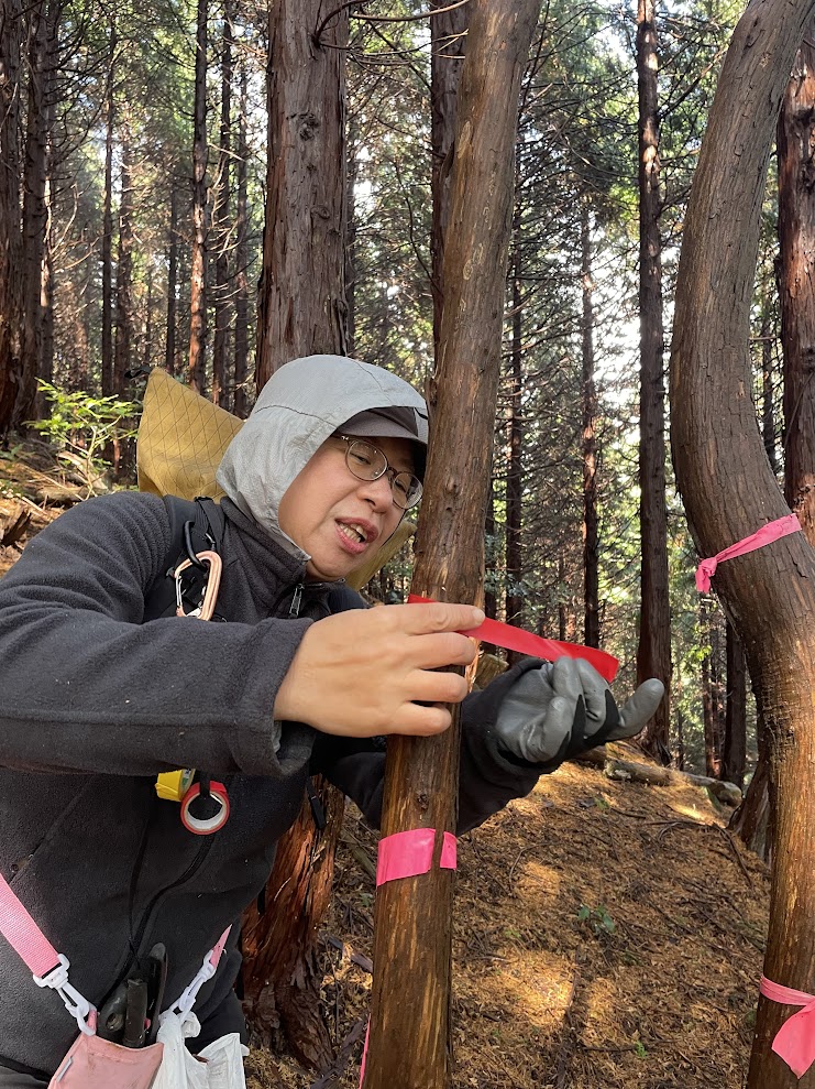 杉の木の成長を妨げるのもはばかられるためテープを貼り替えるも、雨で幹が濡れてテープがくっつかず、貼り替えに時間がかかります。