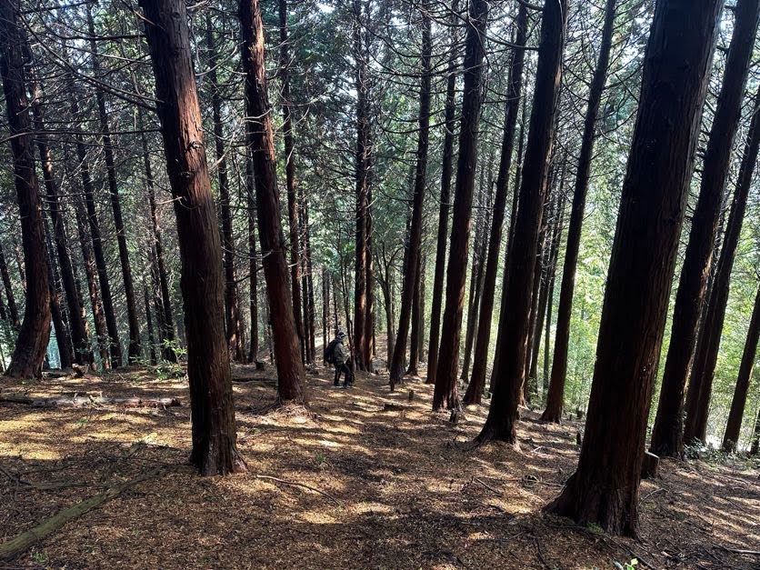 道の荒れ感は薄いけど、どこでも通れちゃう感じがあったり、背の高い杉の森はひんやりして薄暗いので不安感が増します。