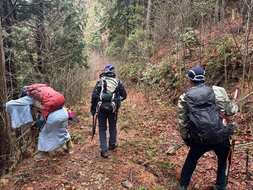 前日、地元のSさんが雨のなか下見に行ってくださったところ、雨のせいもあるかもだけどぬかるんで車のおなかがこする状況、乗り入れは厳しいと判断。中倉峠の発着としました。
