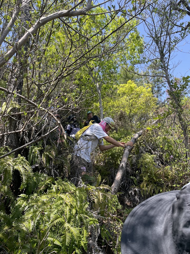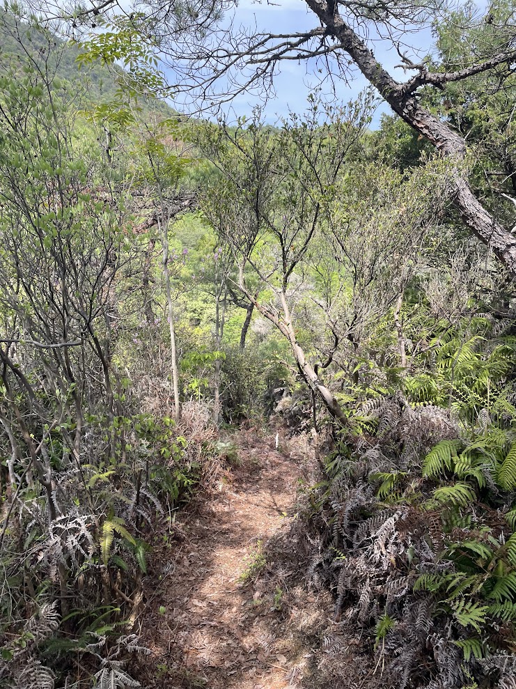 前回の整備はこの岩場に届いたところで終了した、と聞いた通り、岩場を越えた途端、道の両側から伸びてきた枝葉で道が細くなります。顔にかかる枝葉のみ手ばさみで刈り込みながら進んで行きます。