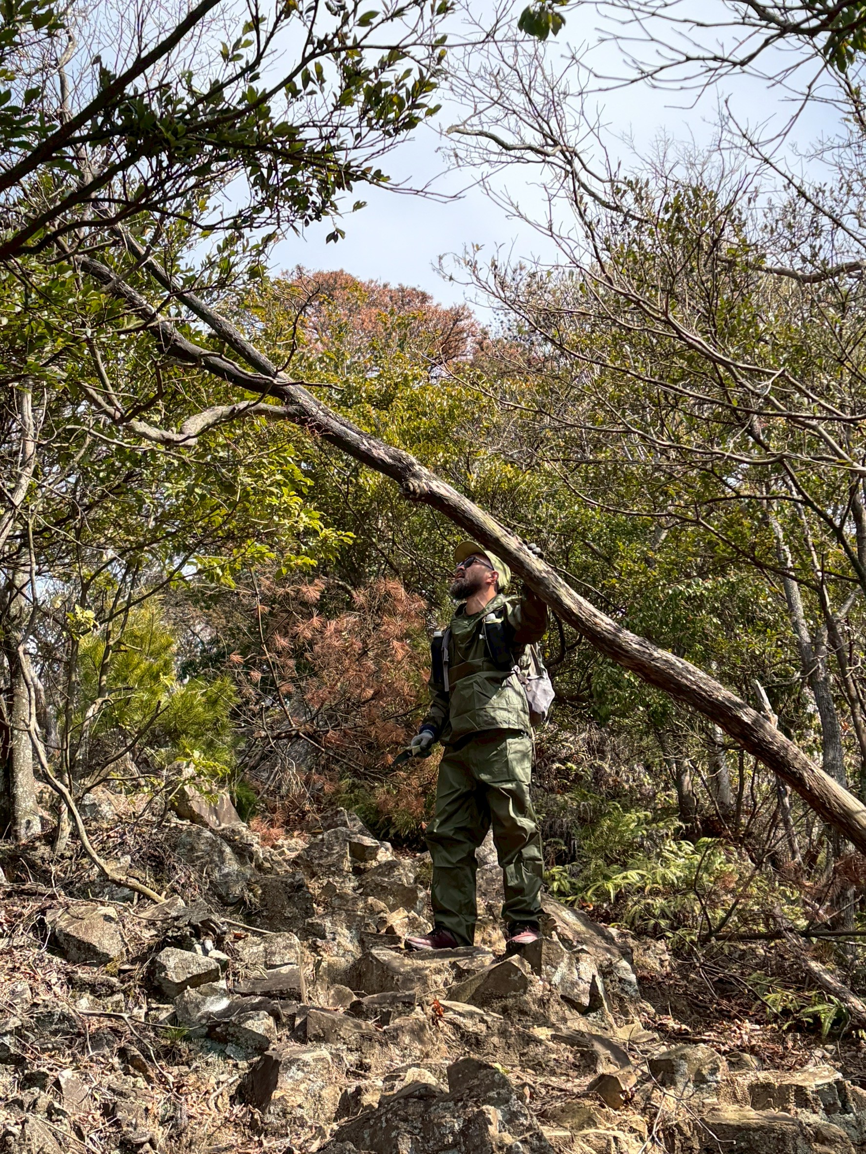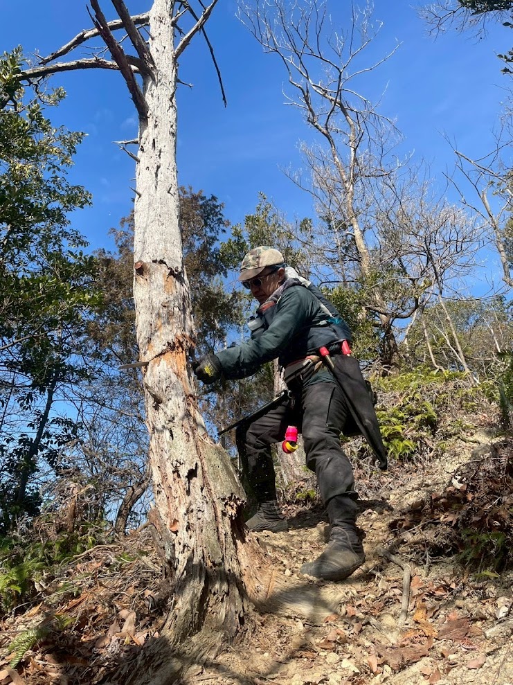 事前に共有された情報で「倒木がすごい」と。古い倒木、立ち枯れの松の巨木のオンパレードをやっつけていくトレイルランナー男組のあとに倒木はなく、道に落ちている松の木の皮に格闘のあとを辿りました。下り後半の落葉掃きは時間切れで持ち越しなれど、トレイルワーク&交流と今日も充実のいちにち、お疲れさまでしたm(_ _)m!!