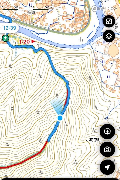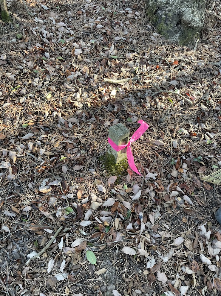 熊手ワークで道筋をしっかりつけておきたかったのは、下山路の中間あたりから、急な下りに差し掛かるまでの区間。えぐれたところも通れるところも全部が落ち葉で埋もれていました。先頭の倒木バスターズのお2人が、熊手で掃いて落葉で埋もれた石柱にピンクテープを巻いてくださったりしていたにもかかわらずやり残してしまったのが悔やまれていました。