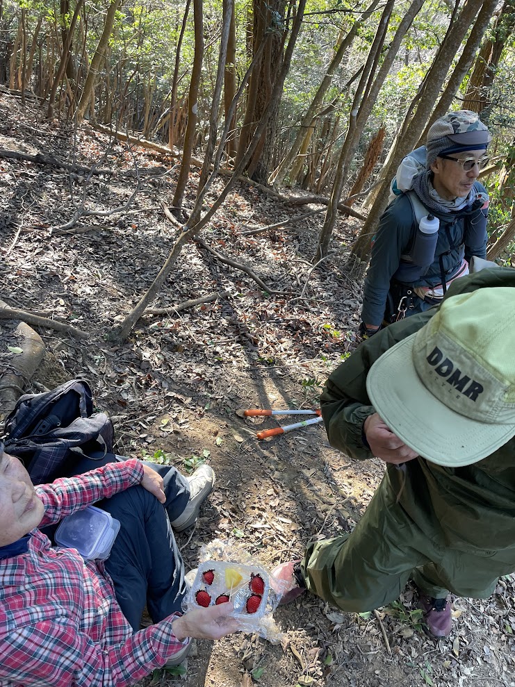 Tさんのフルーツの差し入れに「エイド!!」「走ってて一番嬉しいやつ!!」と喜びの声!北側はひんやりするけど、山頂までは陽ざしが暖かく汗ばむほどの陽気と半端ない活動量に甘い香りのイチゴが沁みました!